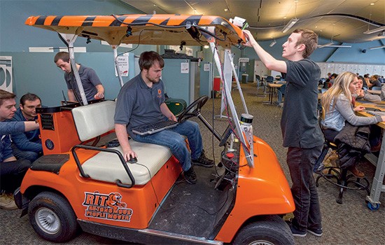 “Prior MSD teams have not used machine learning; this year’s team is the first to do so,” said Ptucha, whose background is in computer vision, robotics, and embedded control systems. “They are using deep learning to determine how to steer the APM. Data from a wide-angle, front-mounted camera is passed into a deep-learning algorithm that labels each pixel as road or non-road, good or bad. It helps the golf cart stay on the path, regardless if it is driving on brick, cement, or blacktop.”