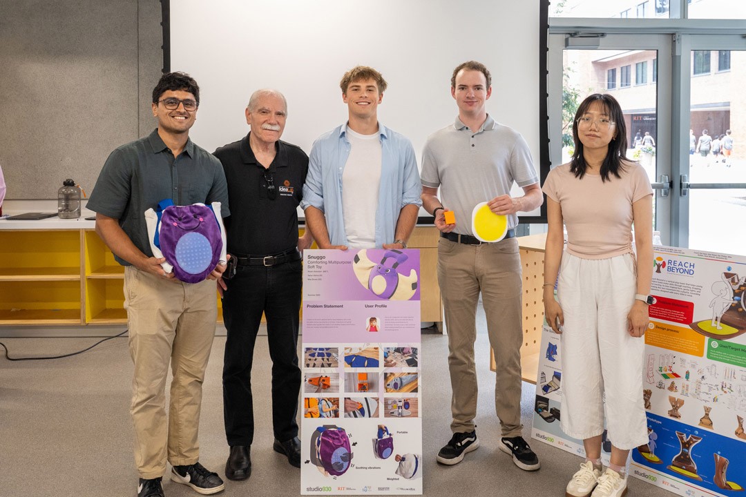 A Studio 930 team designed a wearable toy to help calm children with autism spectrum disorder. RIT students standing with studio manager Dan Harel, second to right, are Varun Varma, at left, Max Brown, center, Noam Arenstein, right, and the team’s design coach, Jacqueline Qiu.