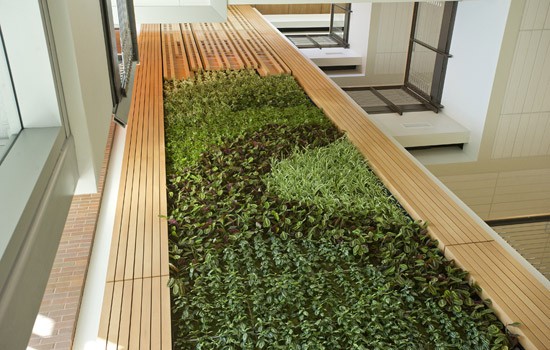 The massive green wall spans 8 feet wide and 38 feet tall near the building’s west entrance, containing 1,776 green plants that contribute to air quality as well as aesthetics.