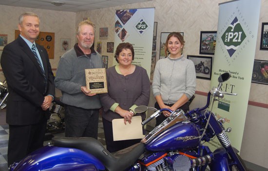 Sumax Cycle products of Oriskany. N.Y. received the P2 Achievement Award from the New York State Pollution Prevention Institute, located at RIT, Oct. 14. Pictured from left to right are: Paul MacEnroe, director of the Mohawk Valley Applied Technology Corporation; Kirk Van Scoten, owner of Sumax Cycle Products; RoAnn Destito, New York State Assemblywoman; and Anahita Williamson, director of the New York State Pollution Prevention Institute.