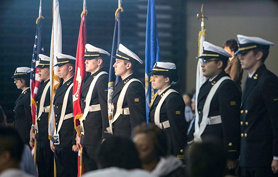 Servicemen and women stand at attention at a prior RIT Veterans Day Breakfast.