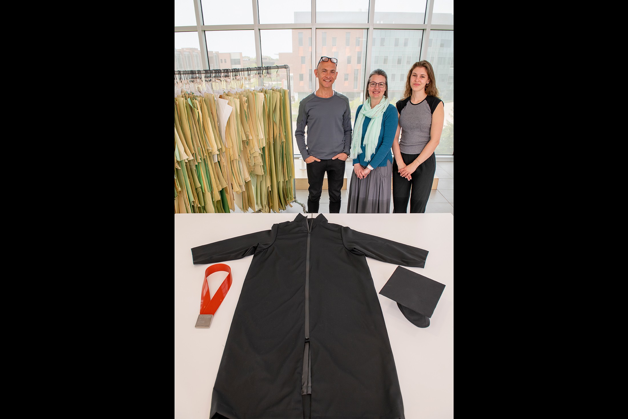 Upper photo: From left, Josh Owen, Melissa Dawson and Clare Maxwell stand beside the fabric from the Vignelli archives used to make regalia (lower photo) that reflects the Vignelli design ethos. Owen will wear the cap and gown at the College of Art and Design commencement ceremony.