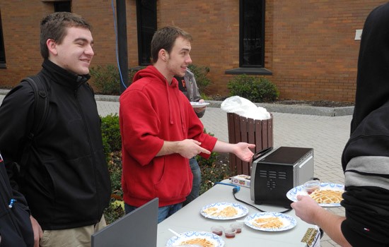 Colden Cullen, left, and Will Hagen are raising money to benefit Hurricane Sandy victims by selling caffeinated waffles for finals week.
