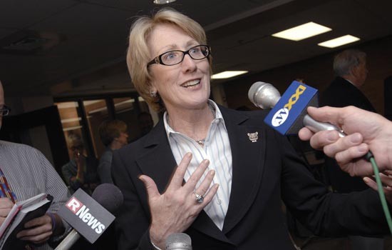 Anne Mulcahy, Xerox Corp. chairman and CEO, speaks to reporters April 24 at RIT. Mulcahy also toured laboratories in the Golisano Institute for Sustainability prior to her address at the Presidential Colloquium. Her talk centered on the benefits of sustainable practices in business.