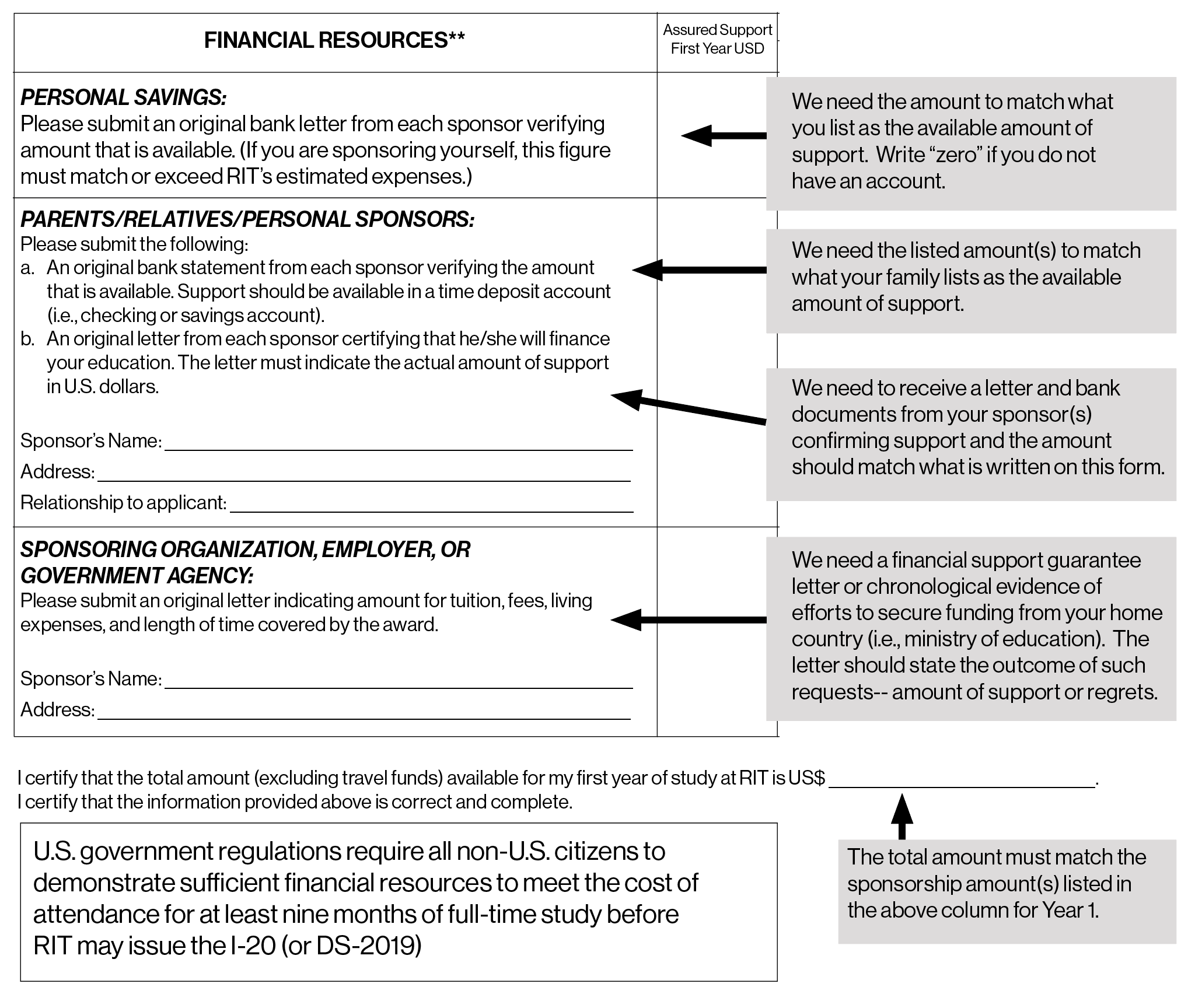Please complete all sections on the Declaration of Financial Support form and provide supplementing documents (i.e. bank statement to report available funds), regardless of amount, and mail original copies to RIT/NTID. Tell us “zero” if you do not have any money (cash or savings) instead of leaving the form blank.