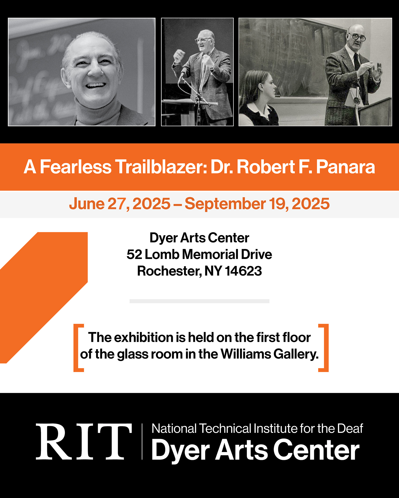 The staff of RIT/NTID’s Joseph F. and Helen C. Dyer Arts Center endeavors to show works by Deaf artists (including those who identify as DeafBlind, Hard-of-Hearing, and Late-Deafened).