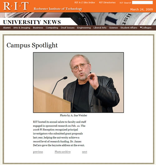 RIT hosted its annual salute to faculty and staff engaged in sponsored research on 12 February. The 2008 PI Reception recognized principal investigators who submitted grant proposals last year, helping the university achieve a record level of research funding. Dr. James J. DeCaro of PEN-International gave the keynote address at the event. The title of his presentation was: Global(eyes): A Partnership Between The Nippon Foundation and NTID at RIT (see the PowerPoint below).