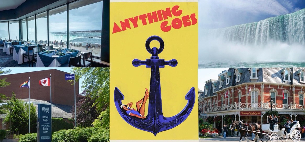 Our day will begin with a relaxing bus ride to Canada. After getting through Customs, we will proceed to Niagara-on-the-Lake, Ontario. You will have time on your own for lunch, shopping, relaxing in the village. We will then meet at the Festival Theatre, no later than 12:45 PM to enjoy Cole Porter’s classic musical, Anything Goes.