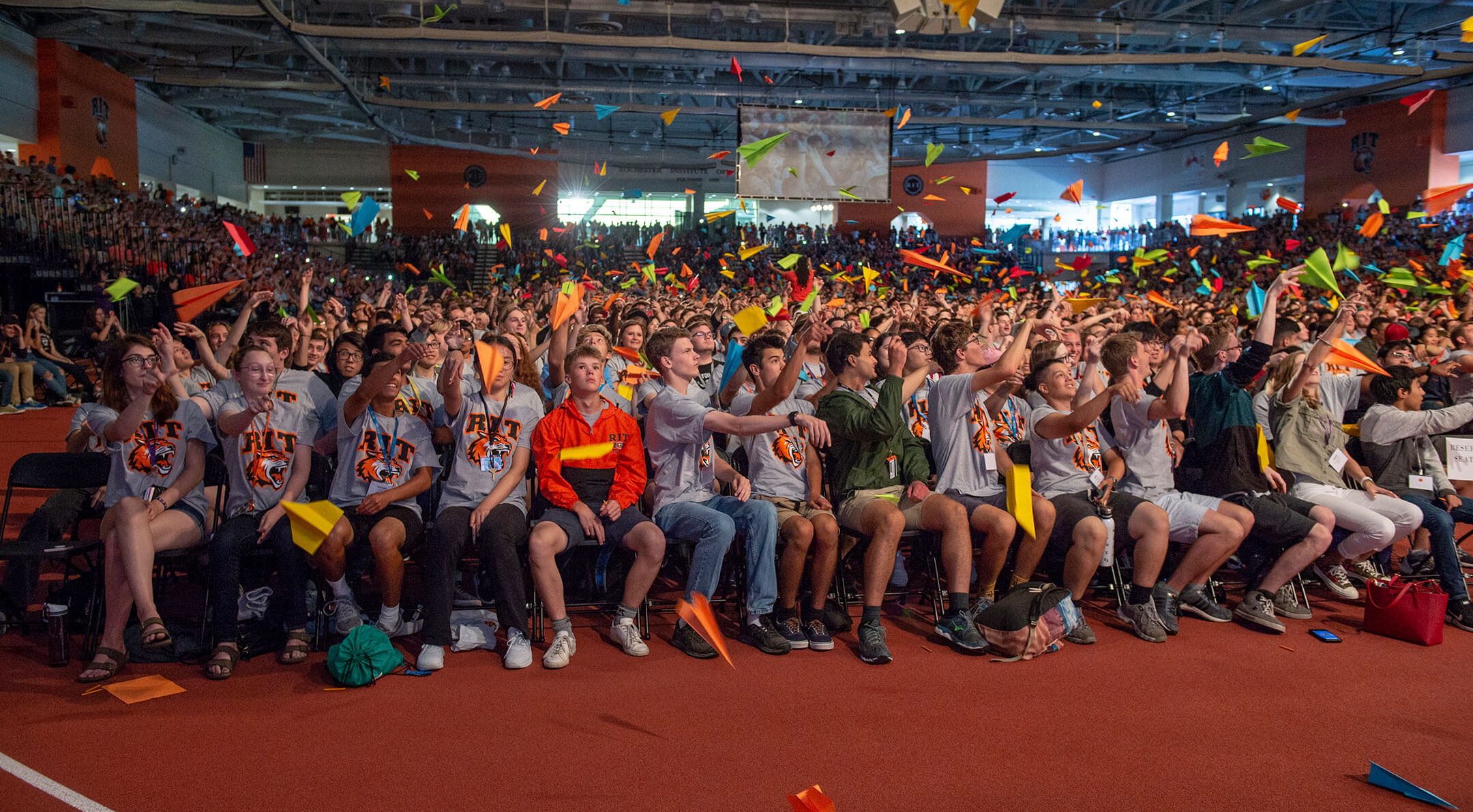 First-year students wrote one of their dreams on a piece of paper, folded it into an airplane, and launched it during New Student Convocation in August.