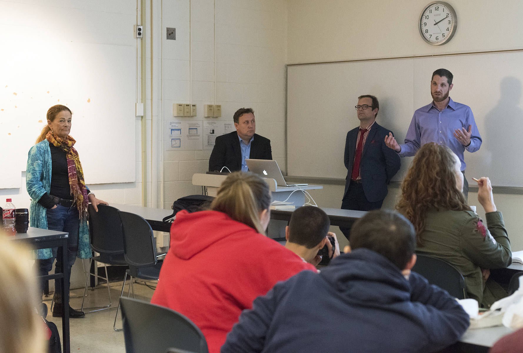 Wallace, far right, presents to a group of RIT Photojournalism students about his Pulitzer Prize-winning work. In 2019, Wallace and fellow RIT graduates and Pulitzer Prize winners and finalists Paula Bronstein (far left), David Carson (second from left) and Edmund Fountain (third from left) visited campus for a series of events.