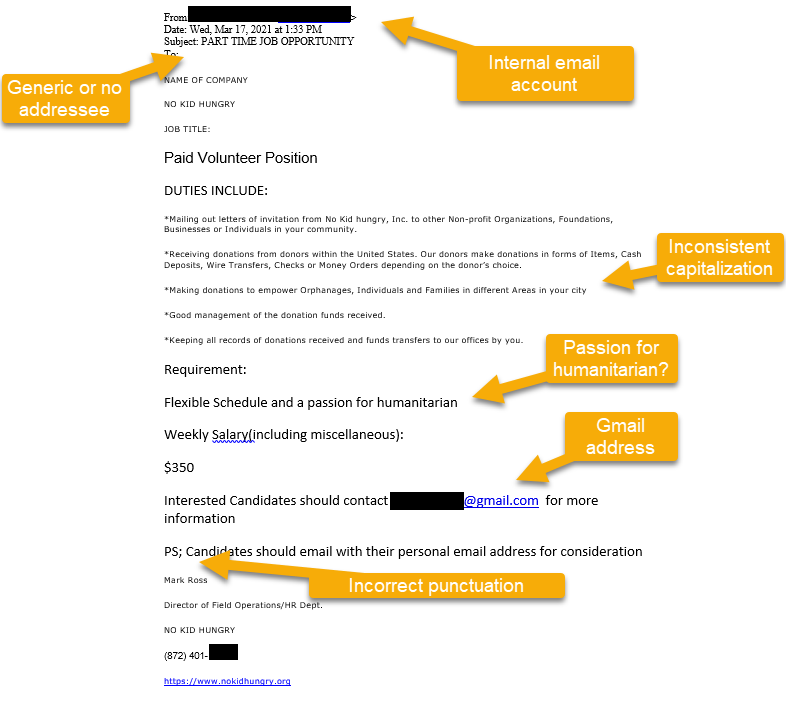 A phishing email purporting to offer a work from home opportunity for No Kid Hungry was received by the RIT Community.