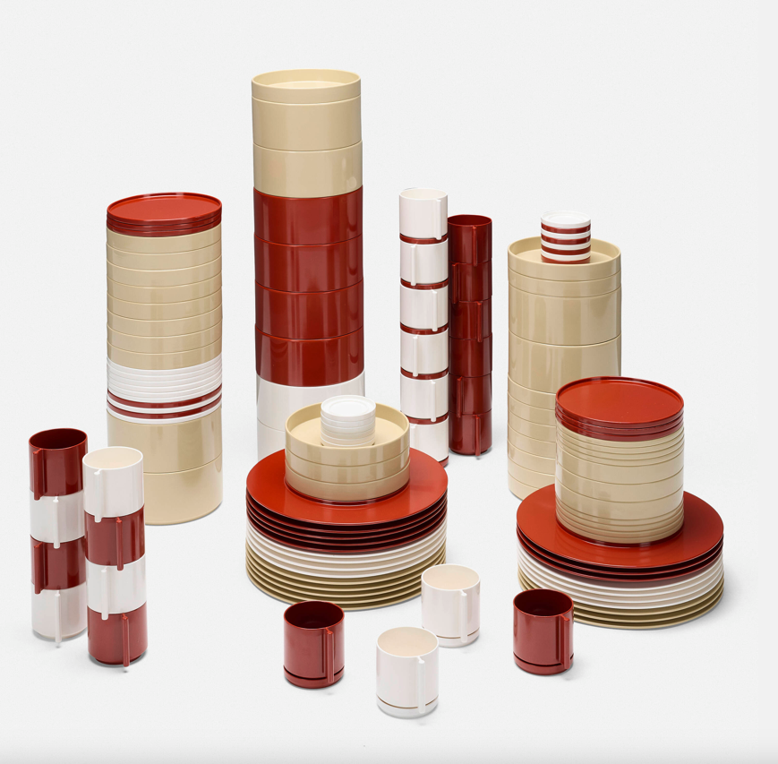 'The basic concept behind this stackable set of melamine dinnerware was to simplify the operation of collecting plates at the end of a meal. The deep plate can contain flatware and leftovers, thereby avoiding the usual, unpleasant operation of removing them before the plates are picked up. All you have to do is stack the plates one on top of the other, everything inside, to obtain a 'clean pile of dirty dishes'. - Lella and Massimo Vignelli