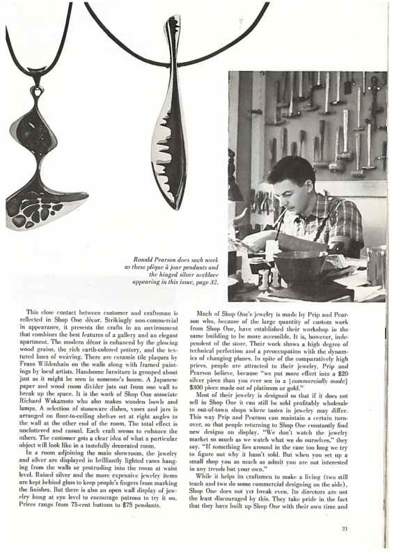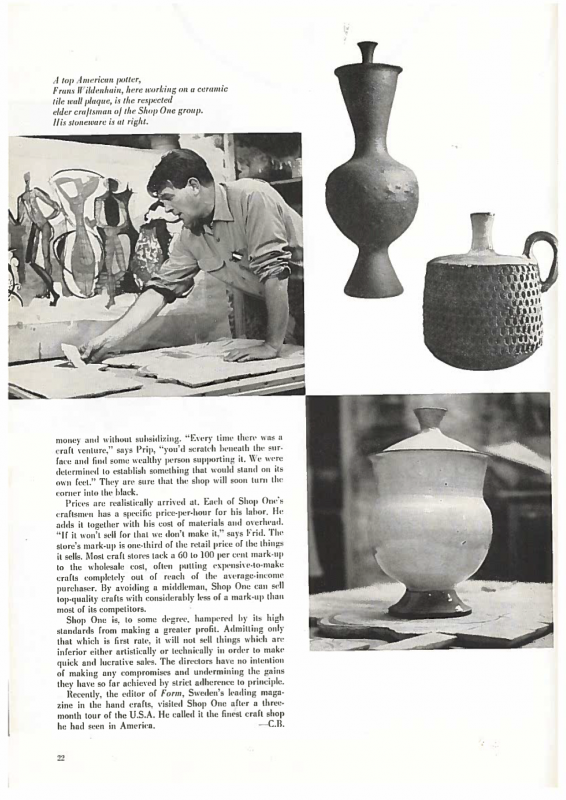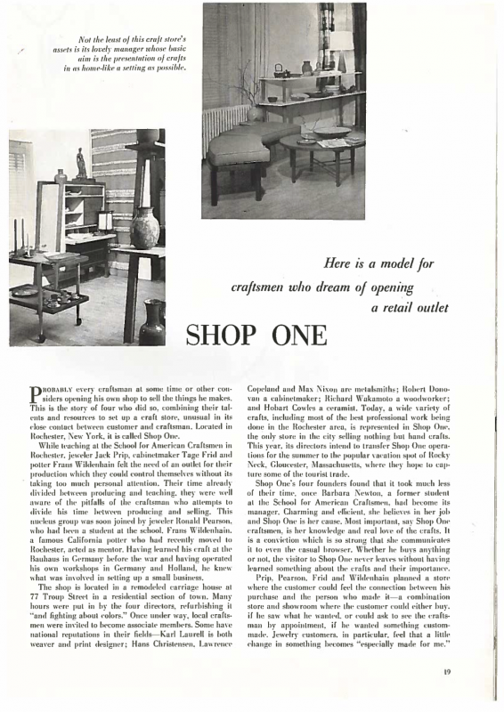 Barbara Newton (Cowles) is acknowledged - "Not the least of this craft store's assets is its lovely manager whose basic aim is the presentation of crafts in as home-like setting as possible". Barbara became a managing partner at Shop One.