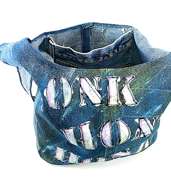 This roomy bucket bag fits comfortably over the shoulder or cross body. Sewn from up-cycled blue jeans with two interior pockets, a gusseted bottom, hand painted and stitched. Add embellishments and make it 100% yours.