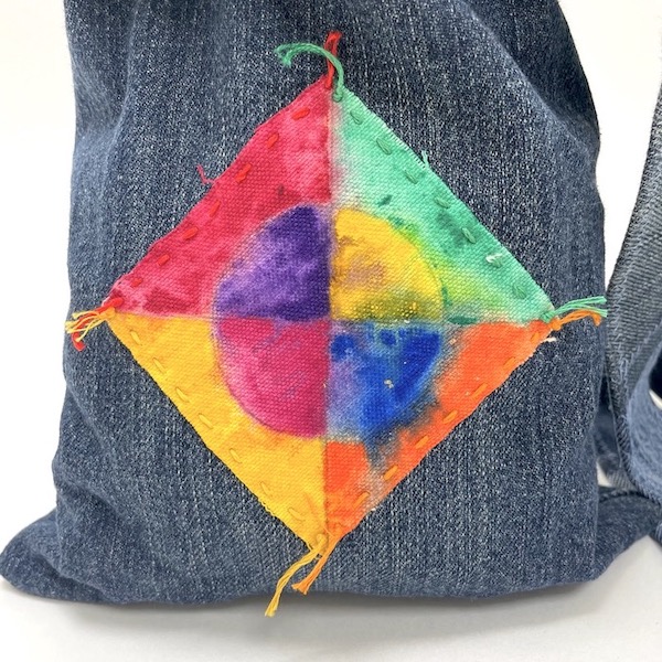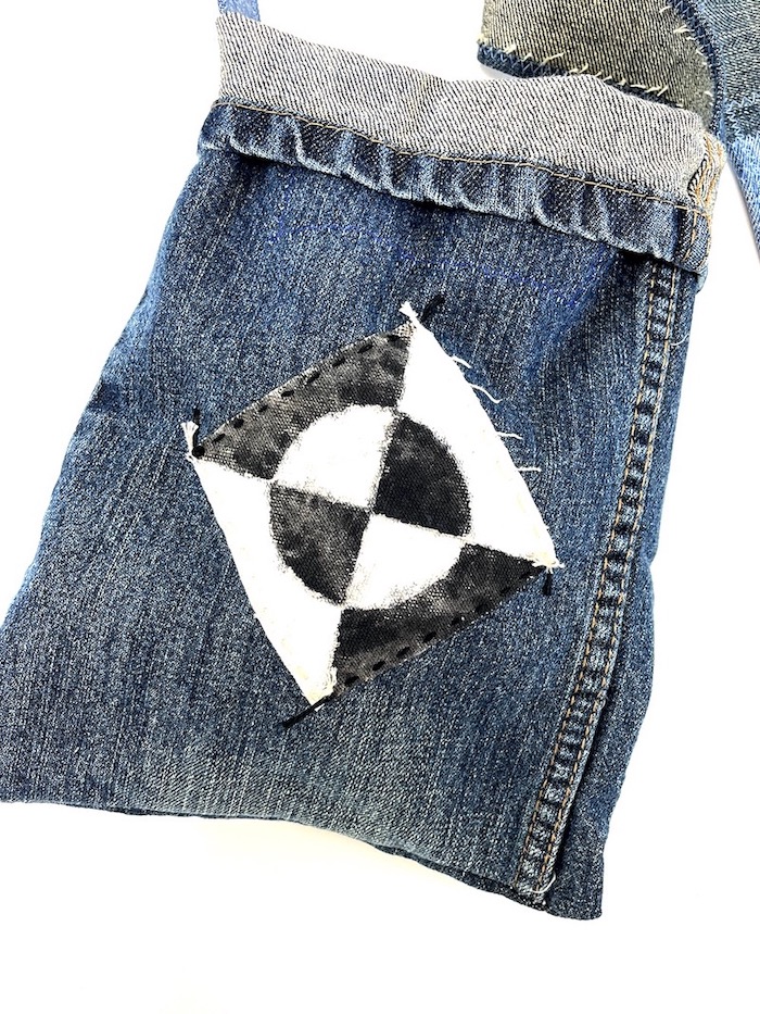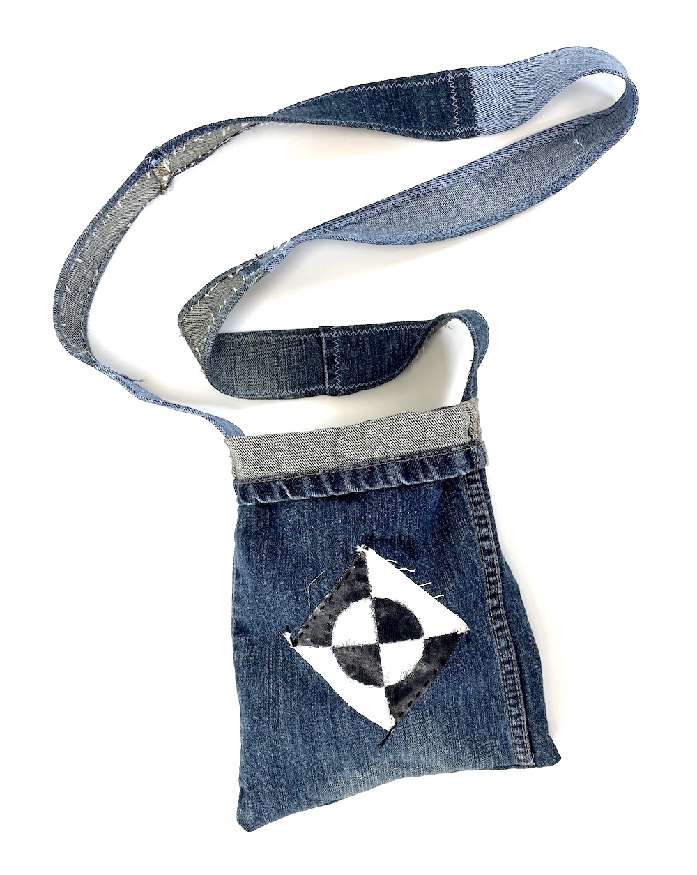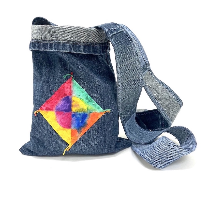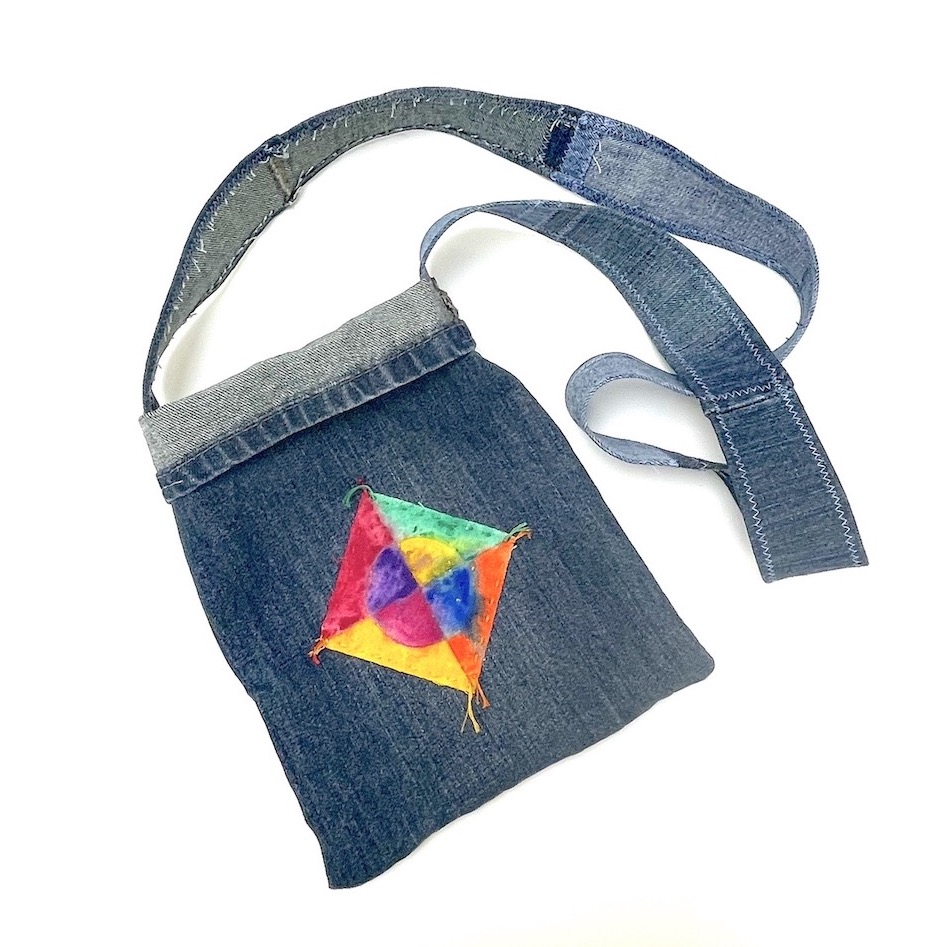 Hand painted elements add a pop of color to this one-of-a-kind cross body bag. Made from repurposed jean fabric, it's useful and perfect for stashing valued possessions.
