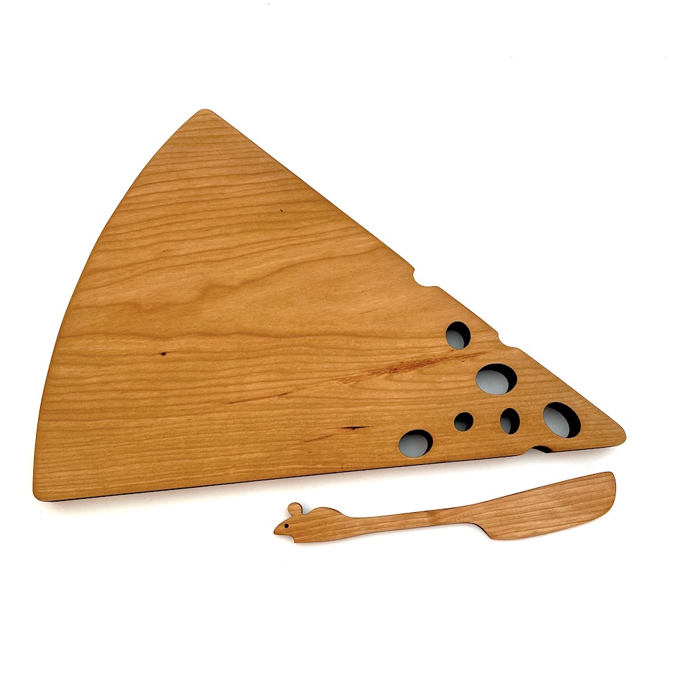 How amazing is this! A cheese board made of solid cherry wood in the shape of a cheese wedge. A perfect gift for you, a housewarming, or holiday celebration! Pair the board with the Mouse spreader (sold separately) to make a charming serving set.