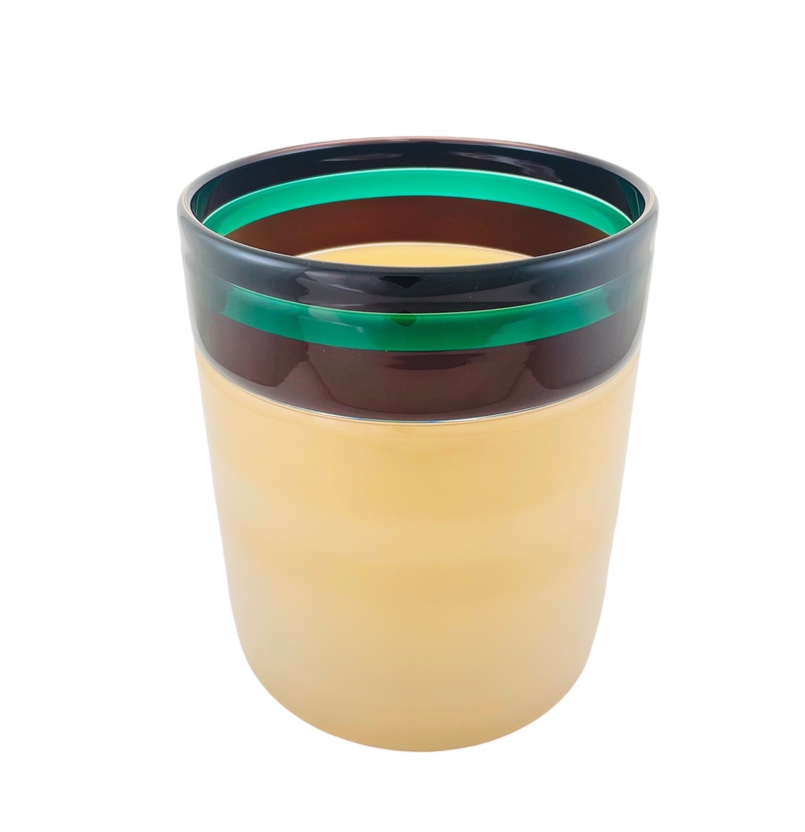This elegant, masterfully crafted hand blown glass cylinder sports an ivory hued base highlighted by a deep purple, black and emerald green hued top band.