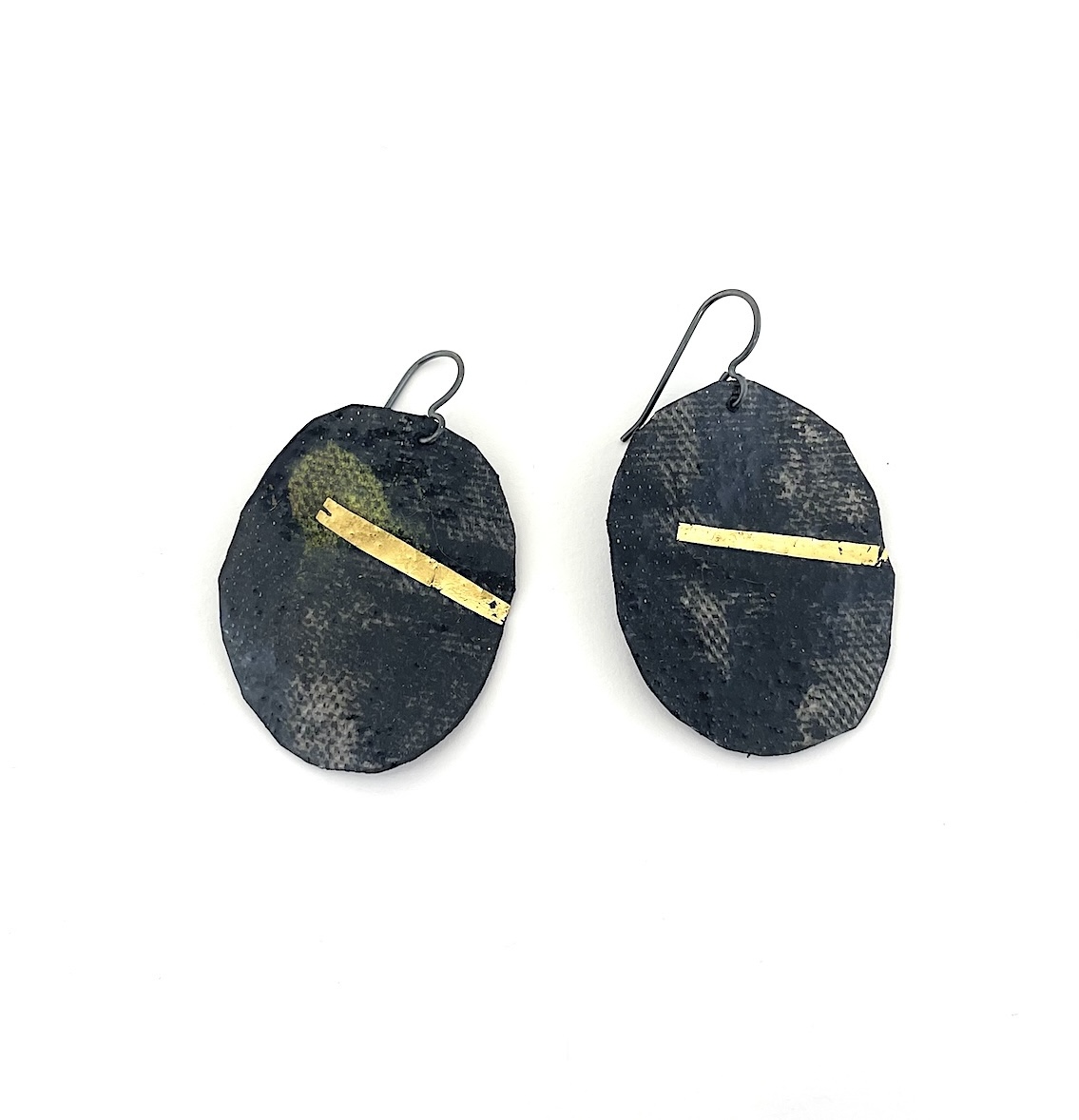 These drop earrings are created by a hand brushed pigment on canvas and highlighted with 14k gold. One-of-a-kind and artistic!