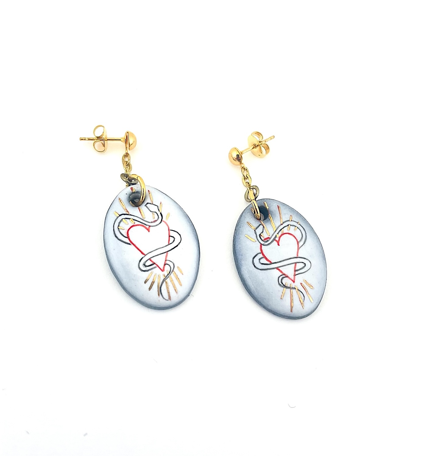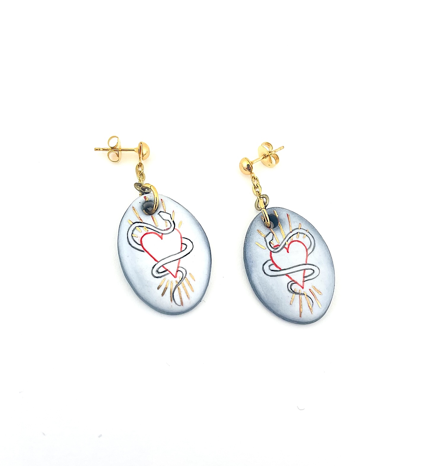 This one-of-a-kind set of earrings is hand cut, fired, hand-illustrated and painted. An underglaze is applied like watercolor which allows for a depth of shading and clarity of pigment. Your very own wearable masterpiece.