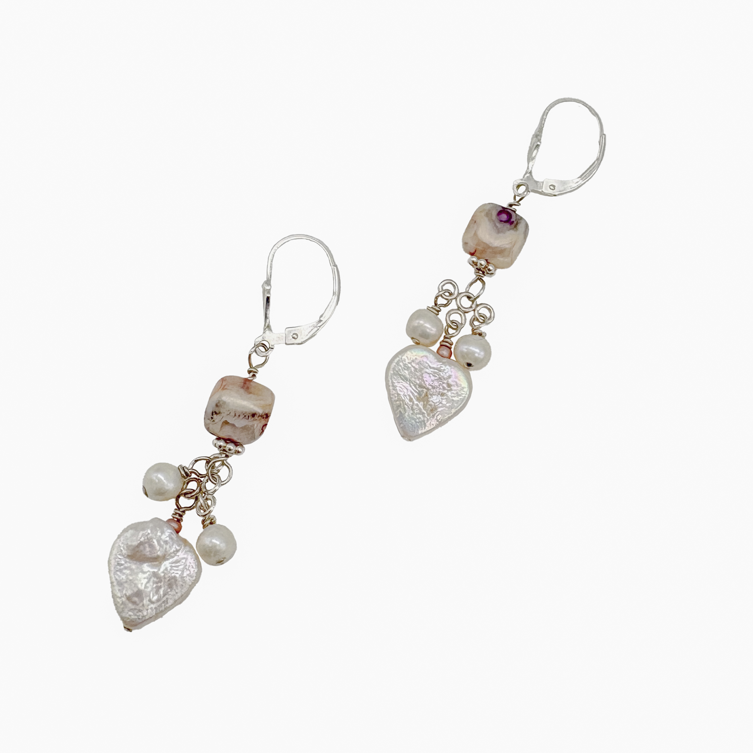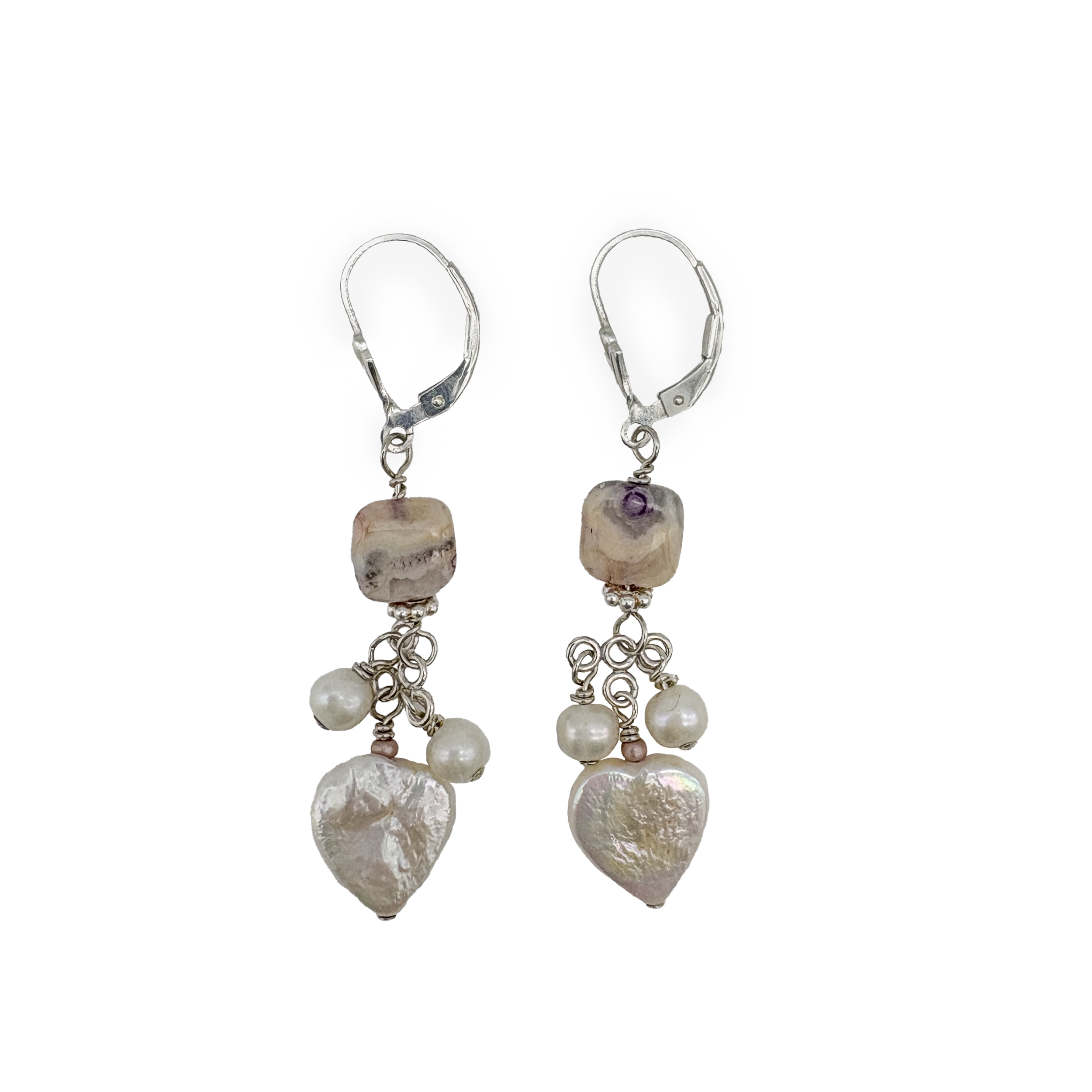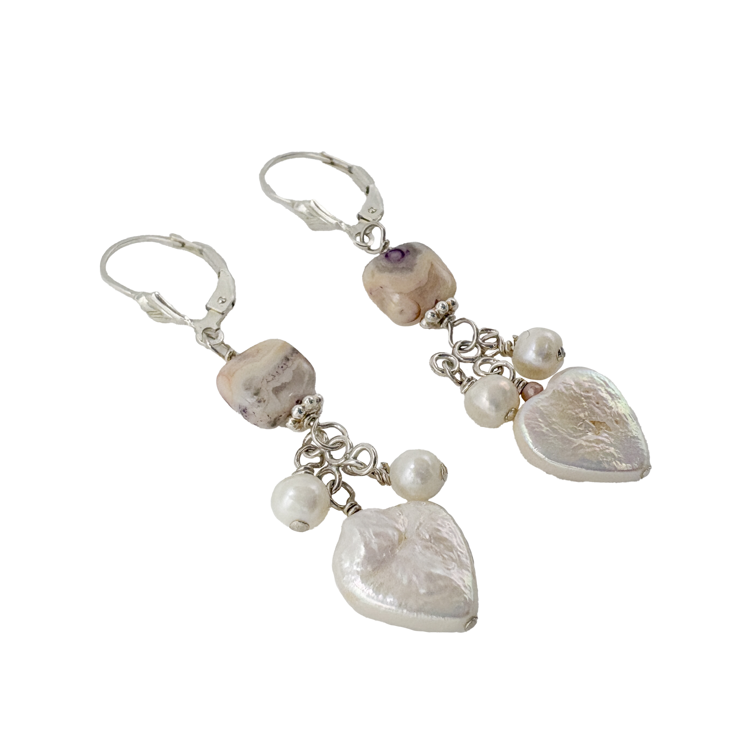 Delicate and eye catching, these dangly heart earrings blend luminous pearls with rich agate accents to create a look that feels both timeless and uniquely expressive! One-of-a-kind.