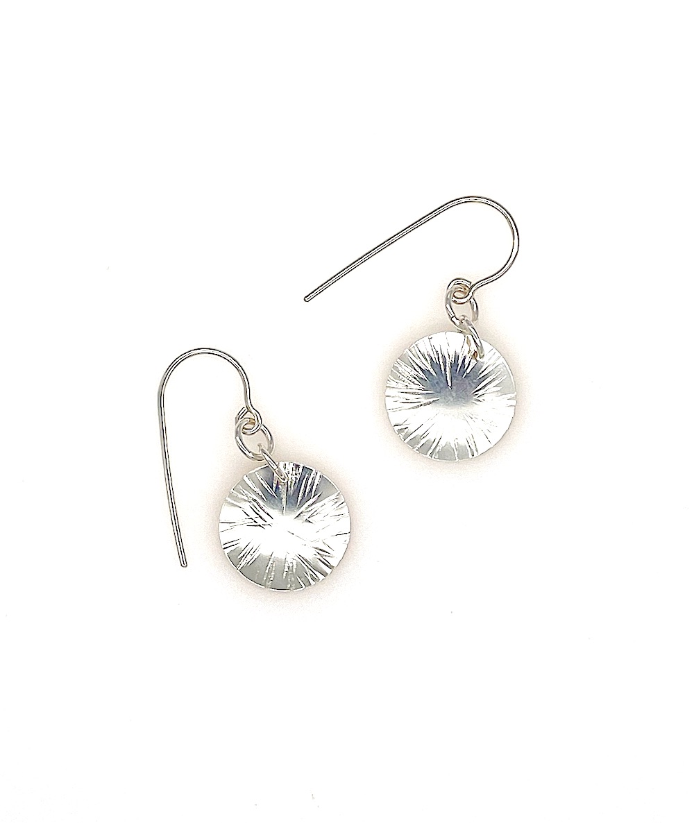 Elegantly simple. A handcrafted pair of Sterling silver disc earrings with an etched sunburst pattern.