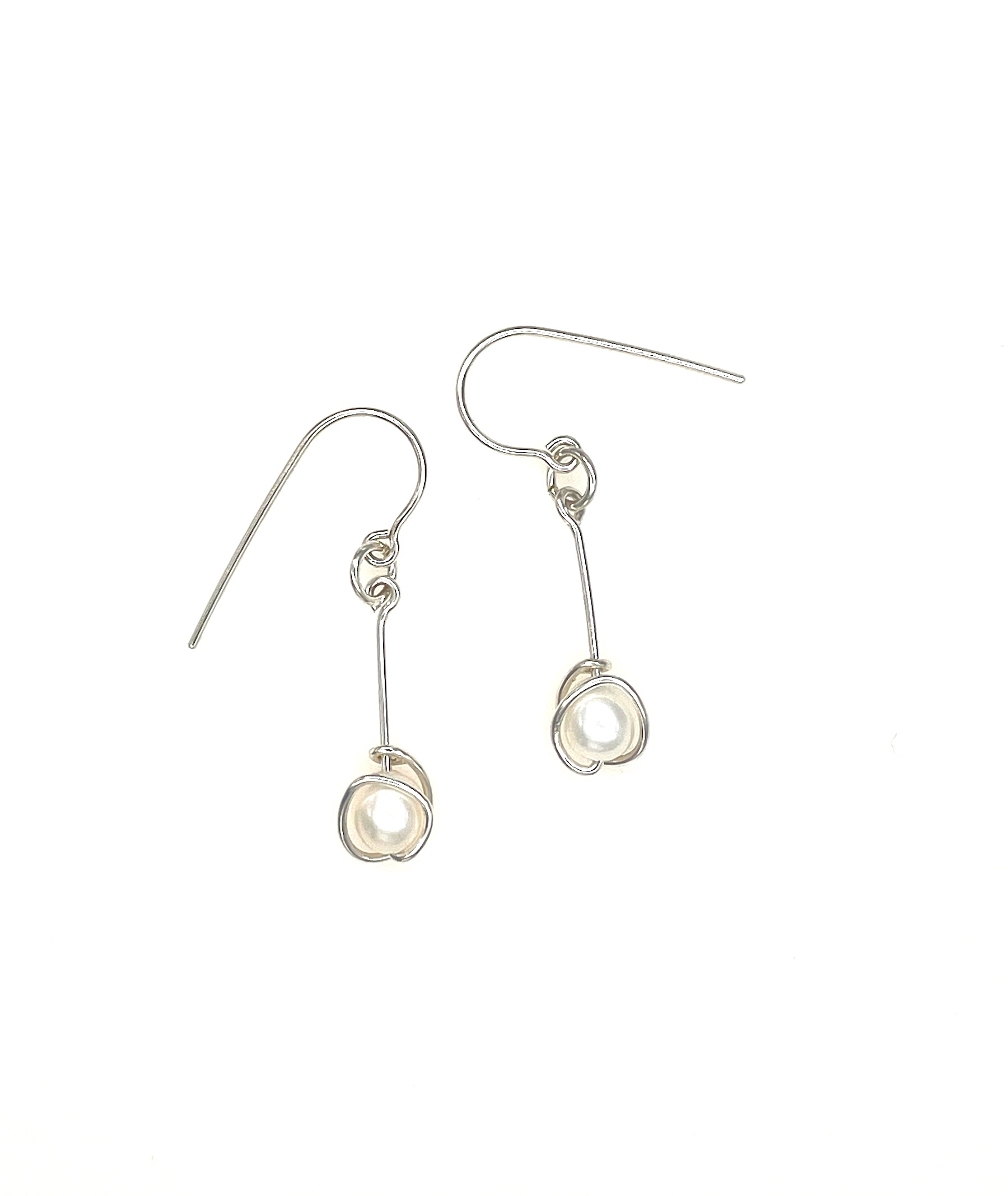 A lovely, lightweight and wearable pair of sterling silver and wrapped white pearl earrings. Wonderful form and great movement!