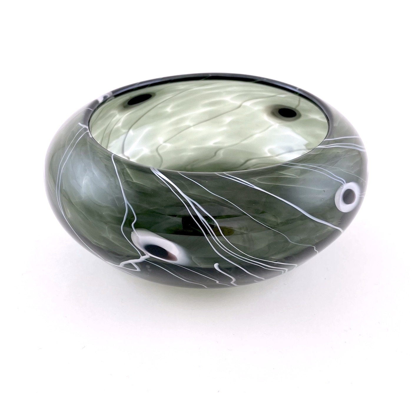 A finely crafted and detailed hand blown glass bowl. The translucent grey green hued body is highlighted with thin trails of white.