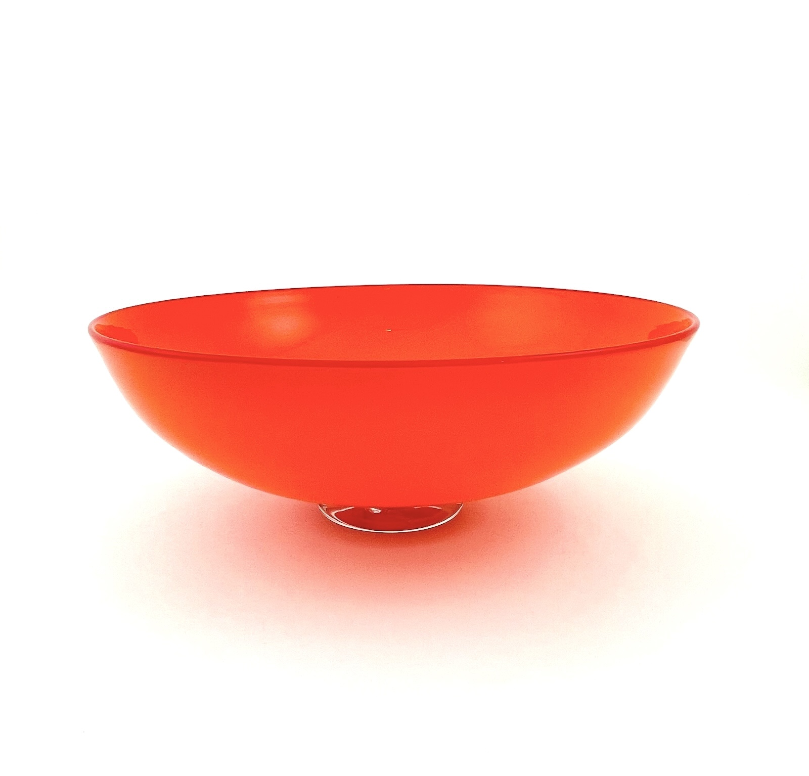 This elegant, sleek form is expertly hand blown. The opaque, bright orange glass bowl is elevated by a clear glass foot and accentuated with a thin bright red lip. A knock out.