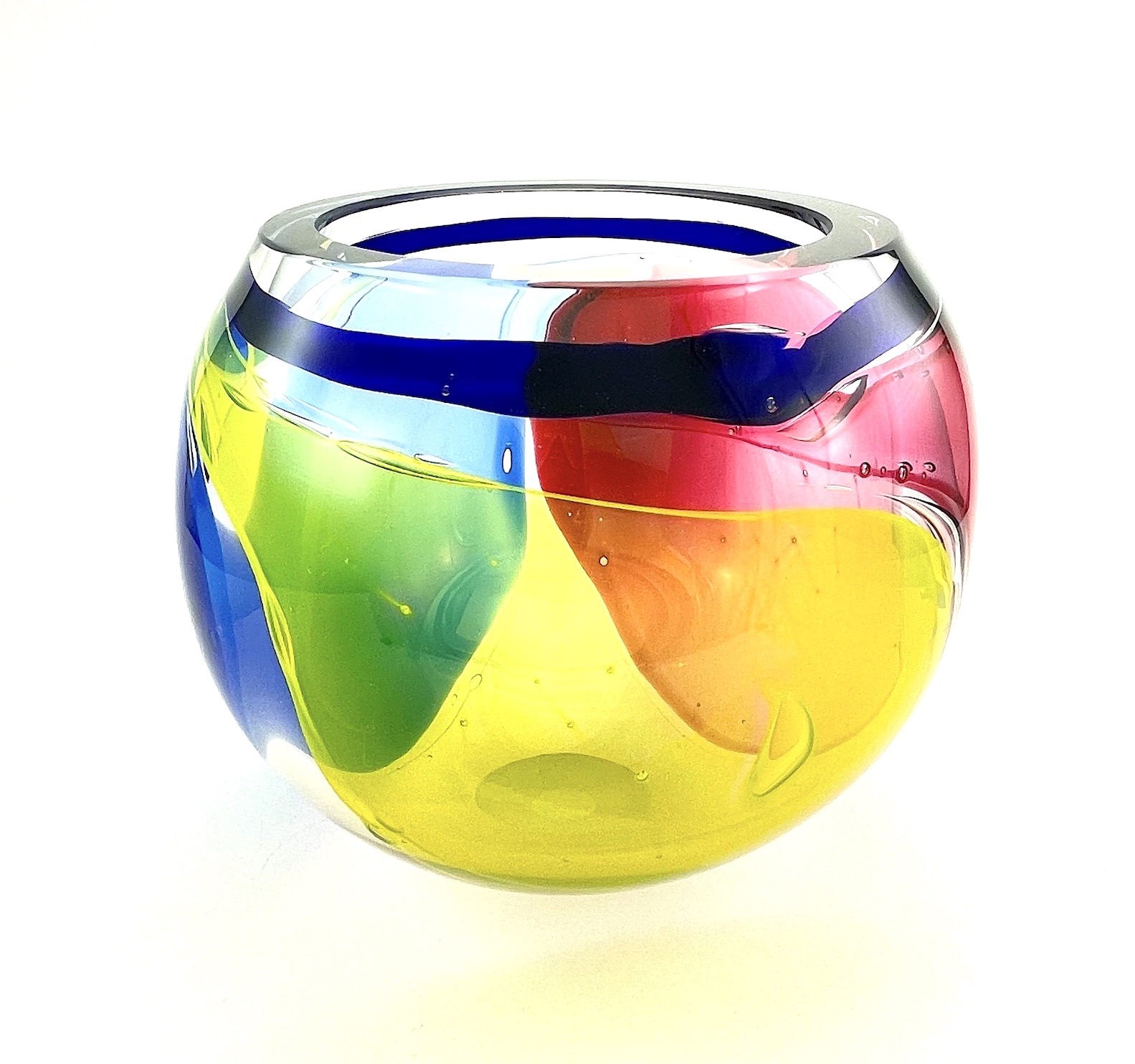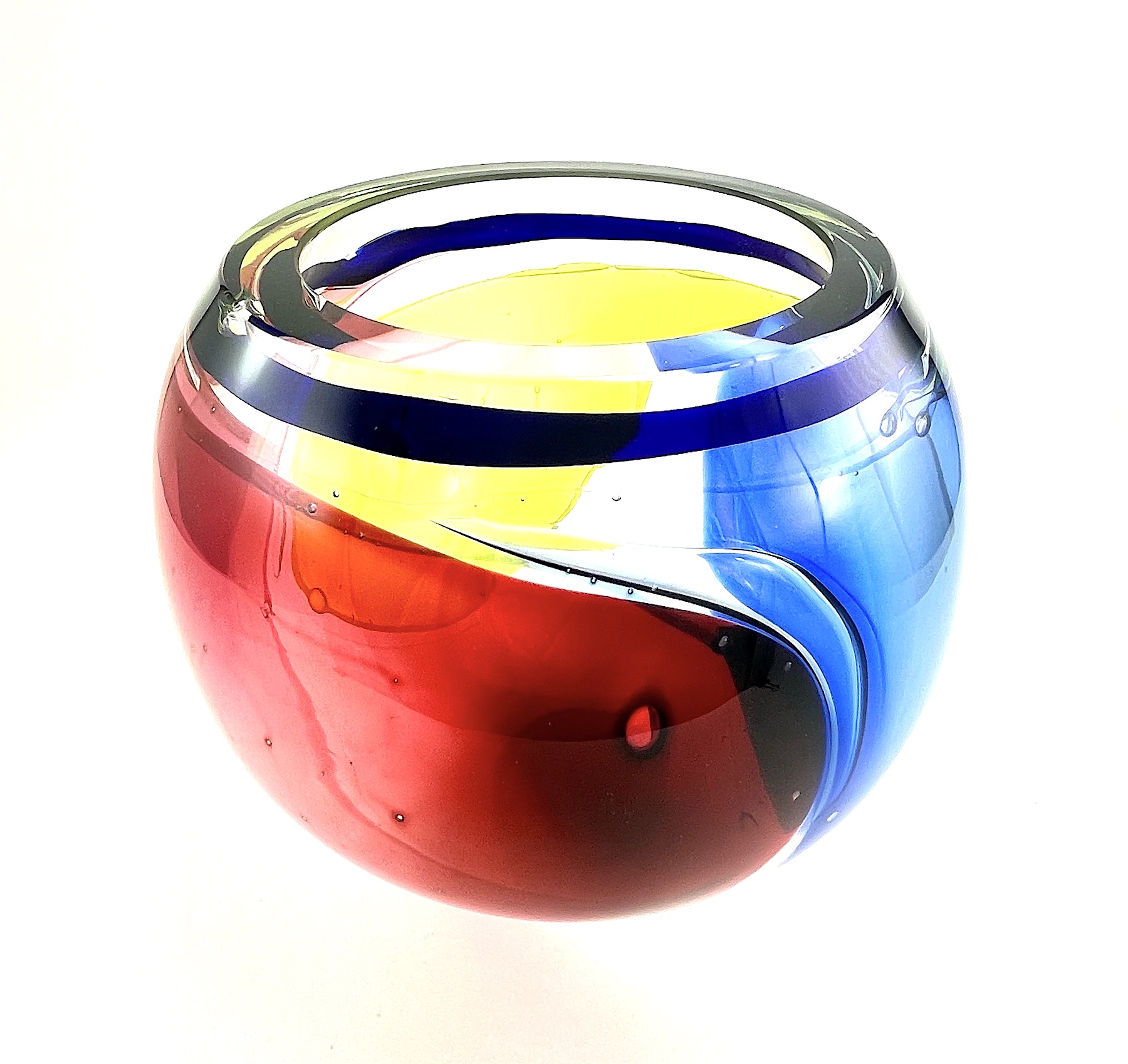 This unique 'lava' bowl is made by gathering molten clear glass and blown into a bowl form. Color is added by blowing individual color spheres of glass and popping them on the surface of the clear glass. The blending and overlap of color is surprising and visually fluid even in its cooled form.