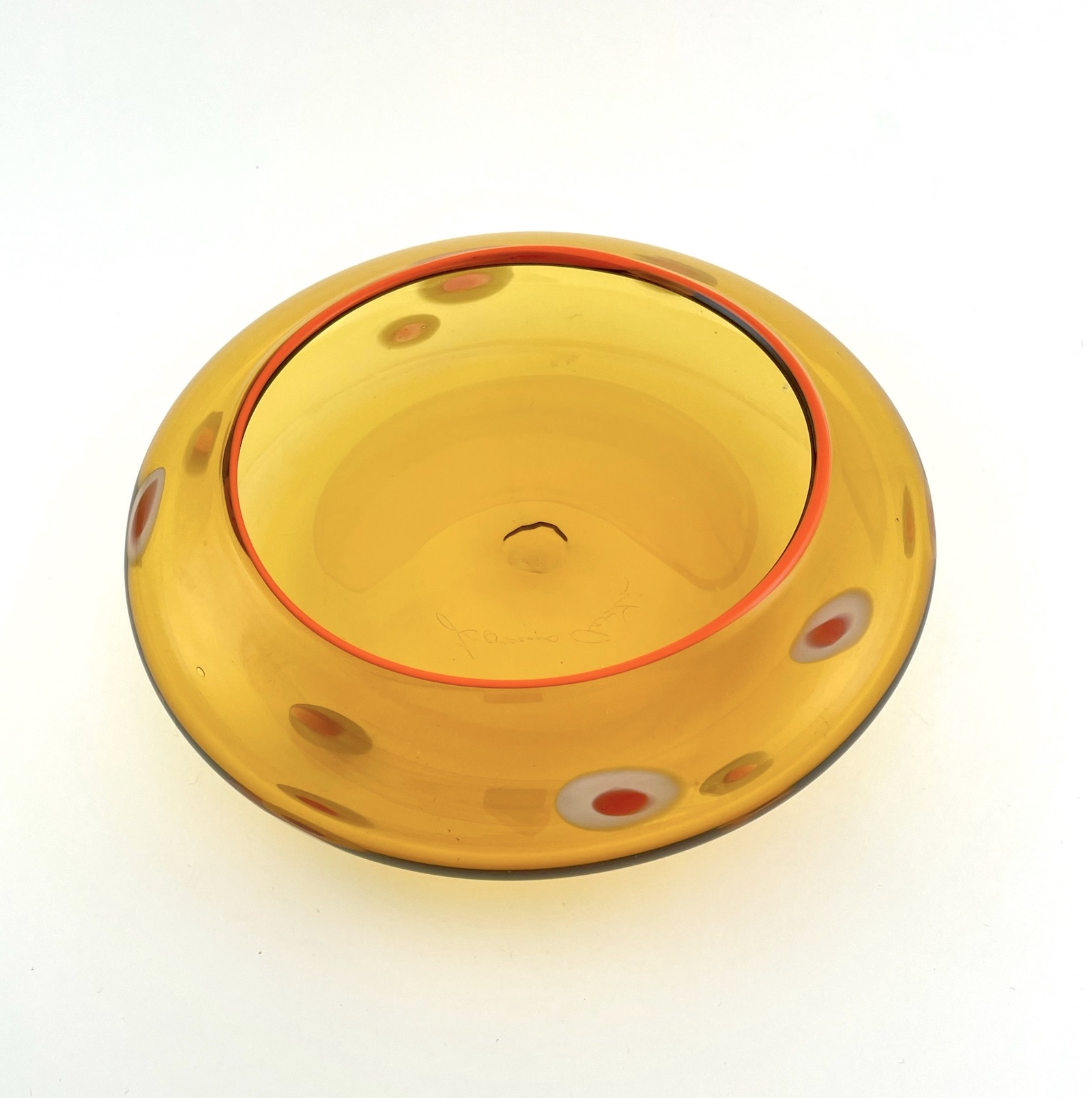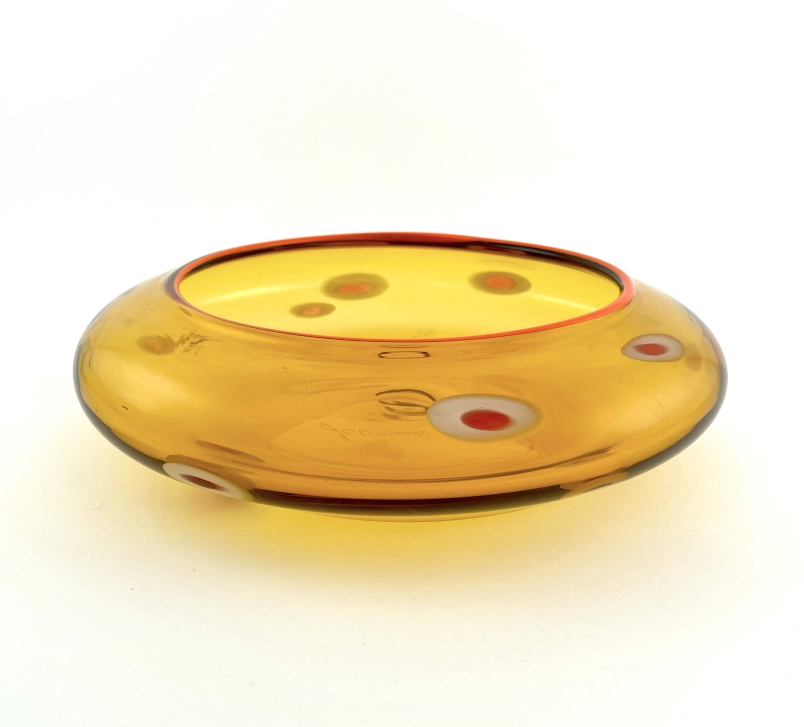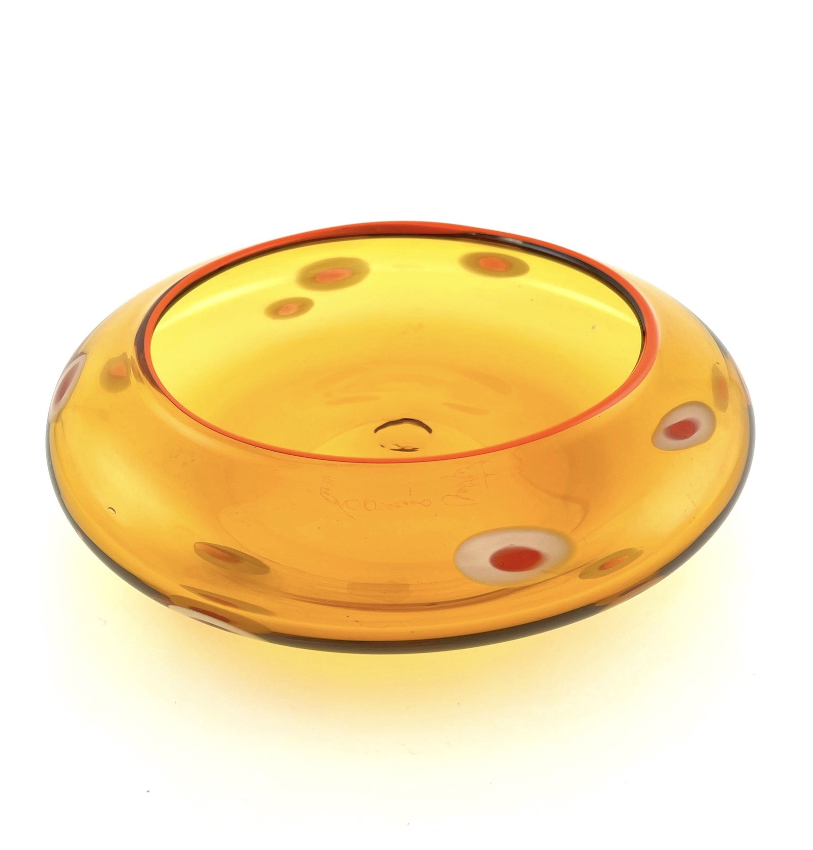 A finely crafted and detailed hand blown glass bowl. The translucent golden orange body is highlighted with murrine rounds of color and a bright orange banded lip.