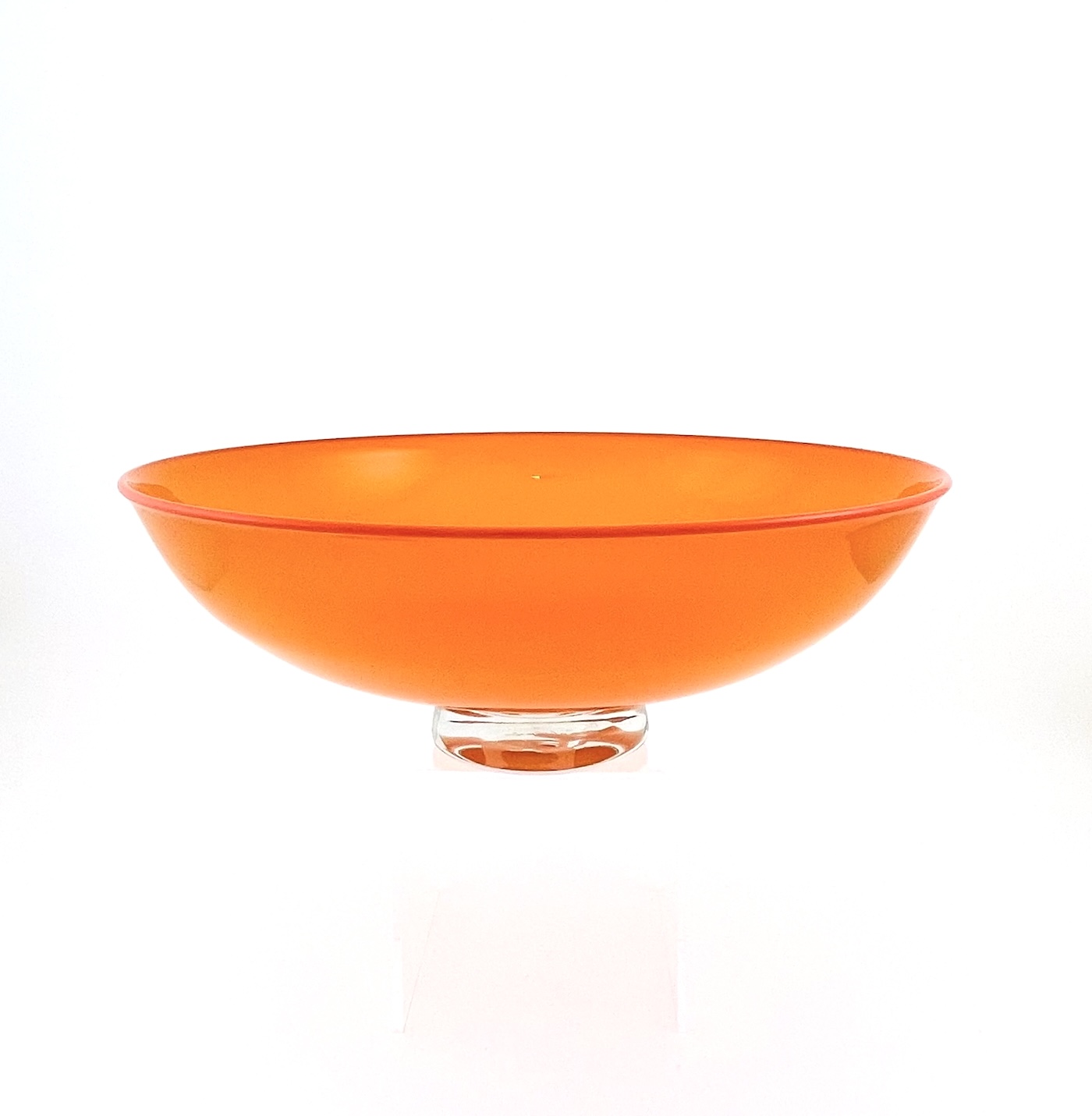 This elegant, sleek form is expertly hand blown. The opaque, bright orange glass bowl is elevated by a clear glass foot and accentuated with a thin bright red lip. A knock out.