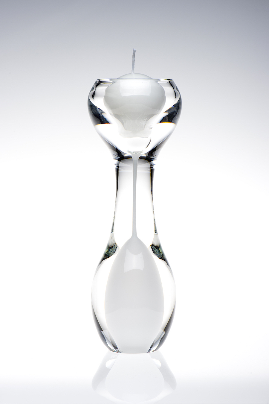 This tall, elegant and weighty candle holder is hand blown utilizing the Swedish/Graal technique in which a colored layer of glass is encased by a transparent layer of glass. The thickness of the glass accentuates the optical qualities of the color. It holds a round votive candle (included).