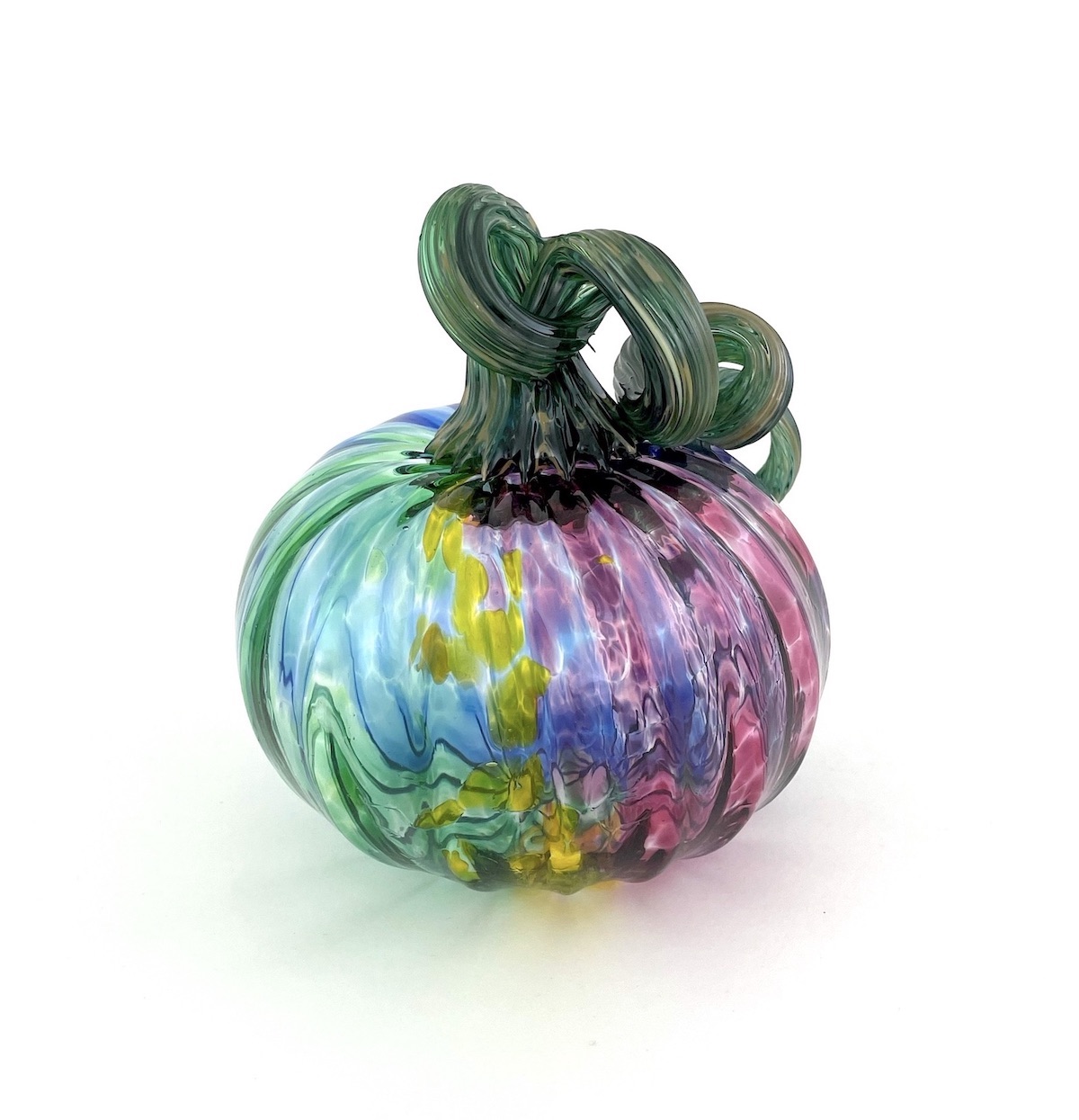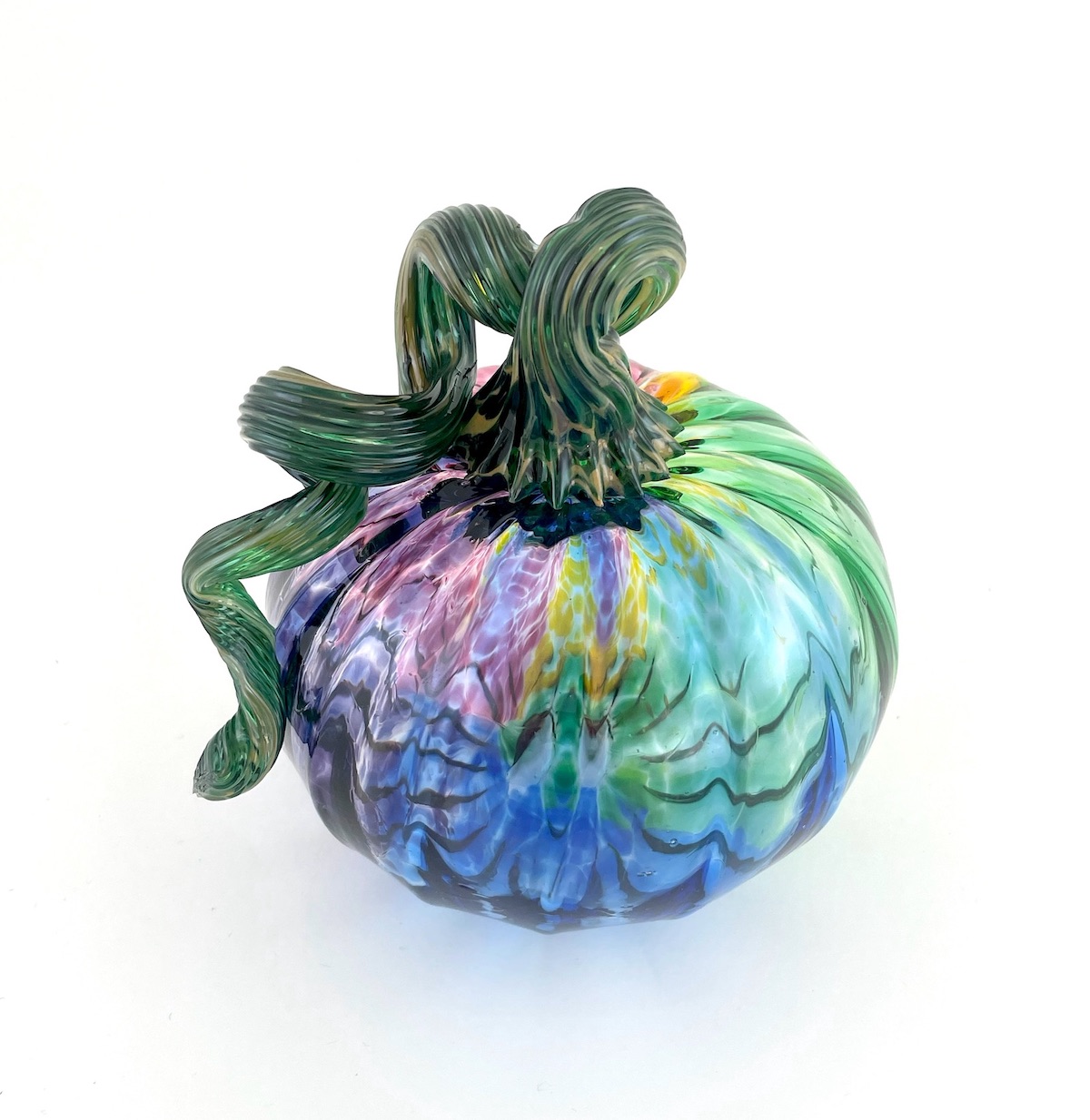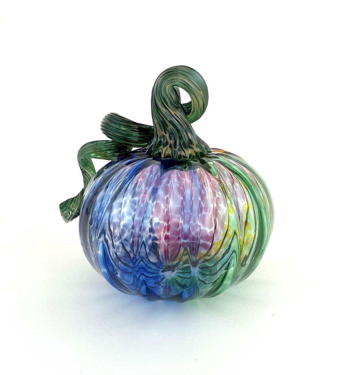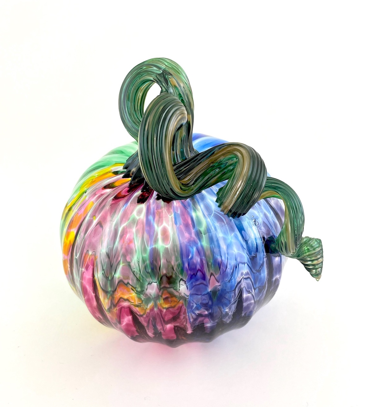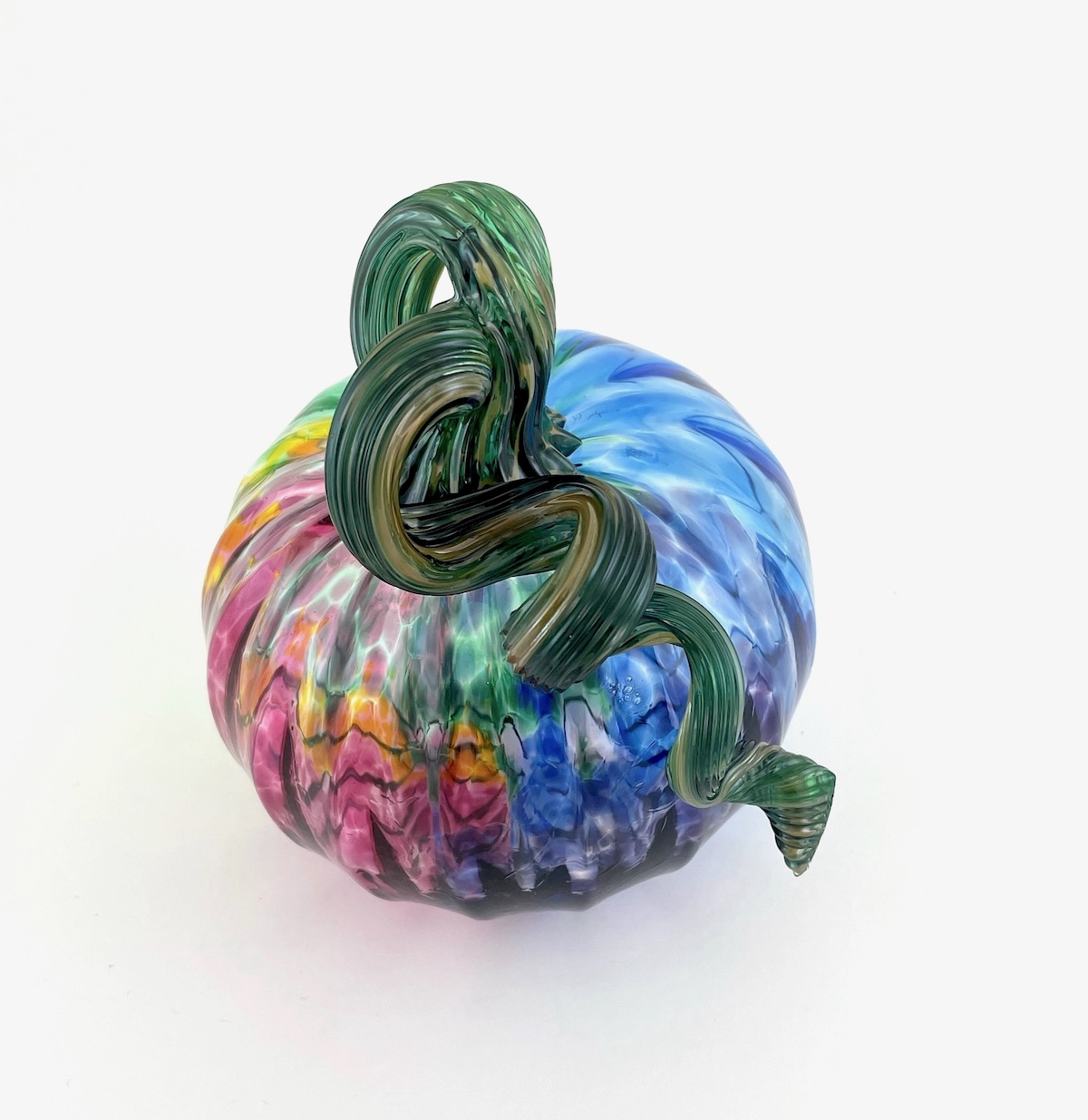 A beautifully bright and bold hand blown glass pumpkin that sports all the colors of the rainbow. Each unique.