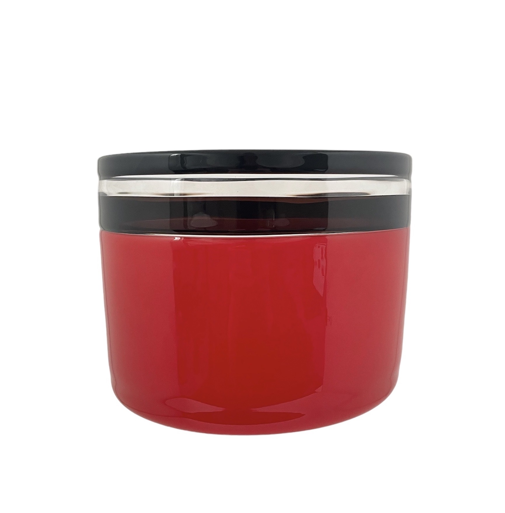 This is masterfully crafted and hand blown glass vessel. It sports a deep cherry-hued base and is accentuated with a black and clear glass band. A stunner!