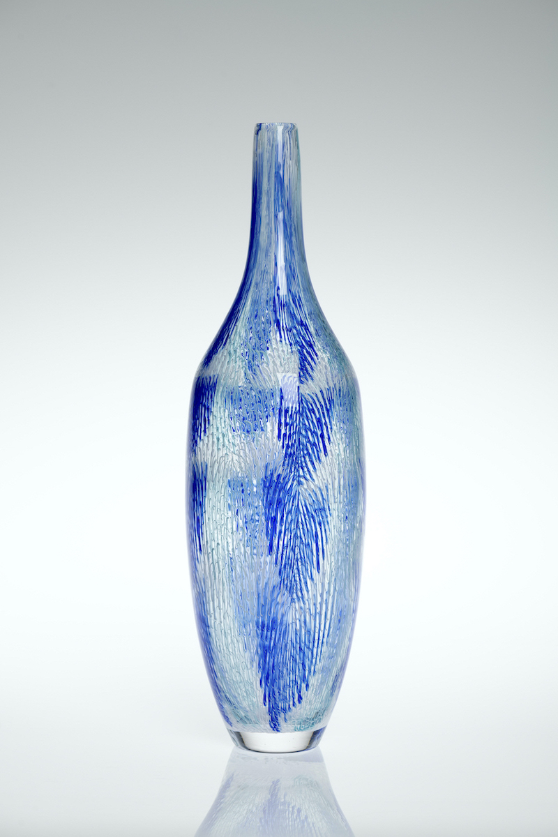 A tall and elegant bottle form with blue hatching that evokes a rainfall. A beautiful addition to any environment. Place near a window to capture the natural light that will further enhance the visual depth.