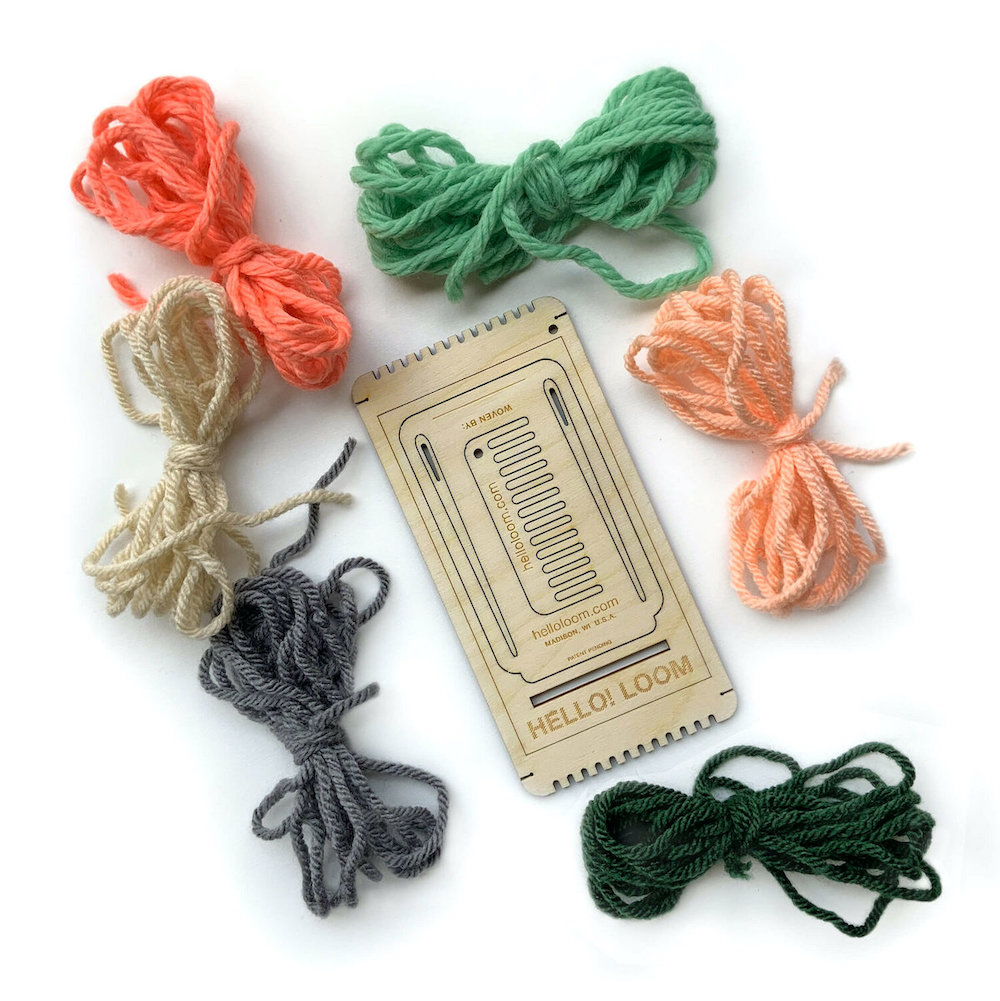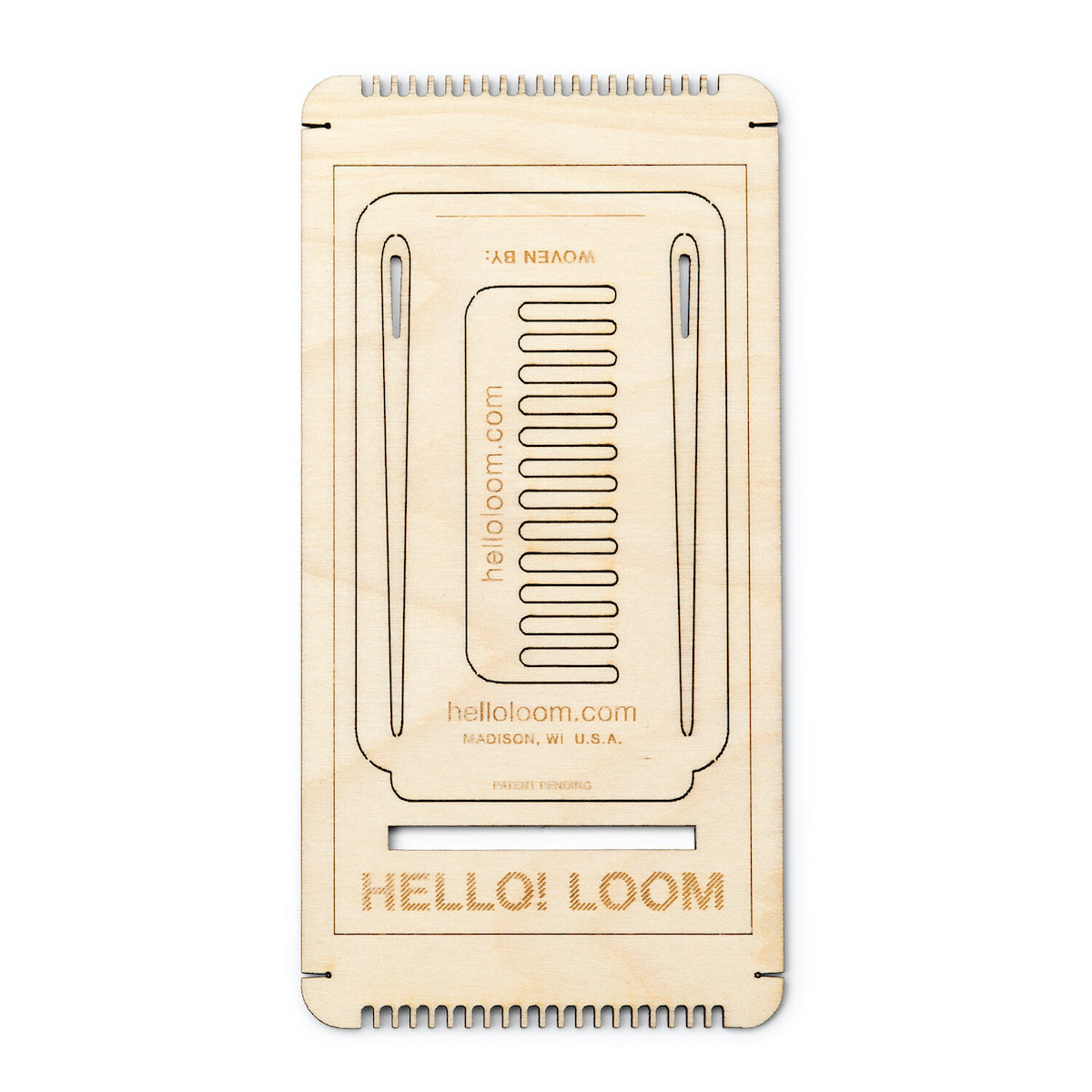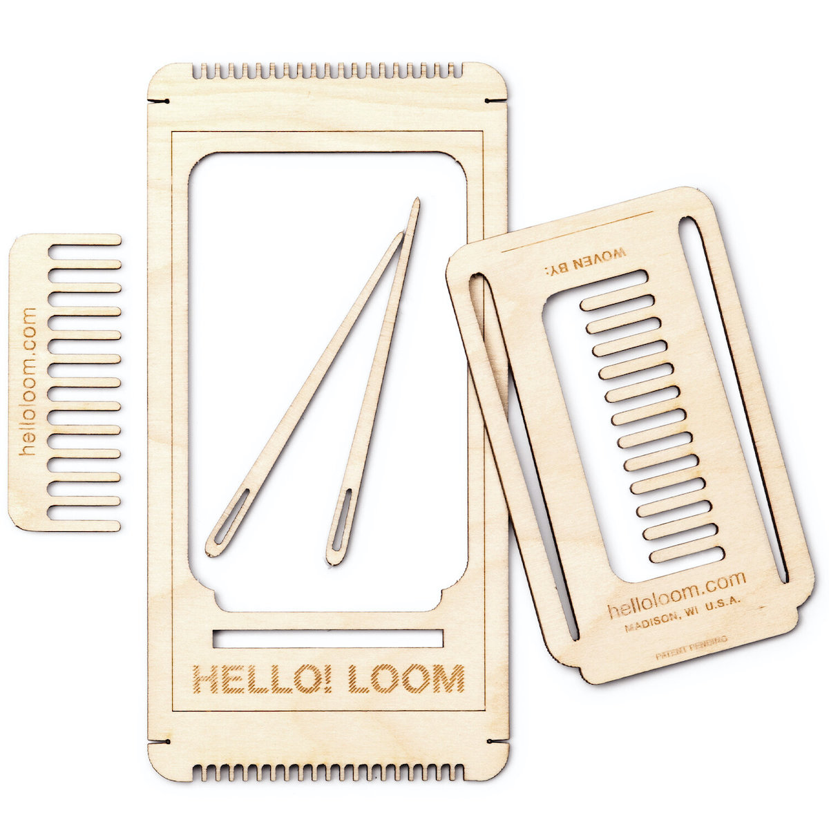 This portable, pocket-sized loom kit comes with all the elements you need to weave embedded in the laser cut wood - two needles, one comb and a stand for displaying your finished work. Three yards of six colors of yarn included. Instructions to get you started.