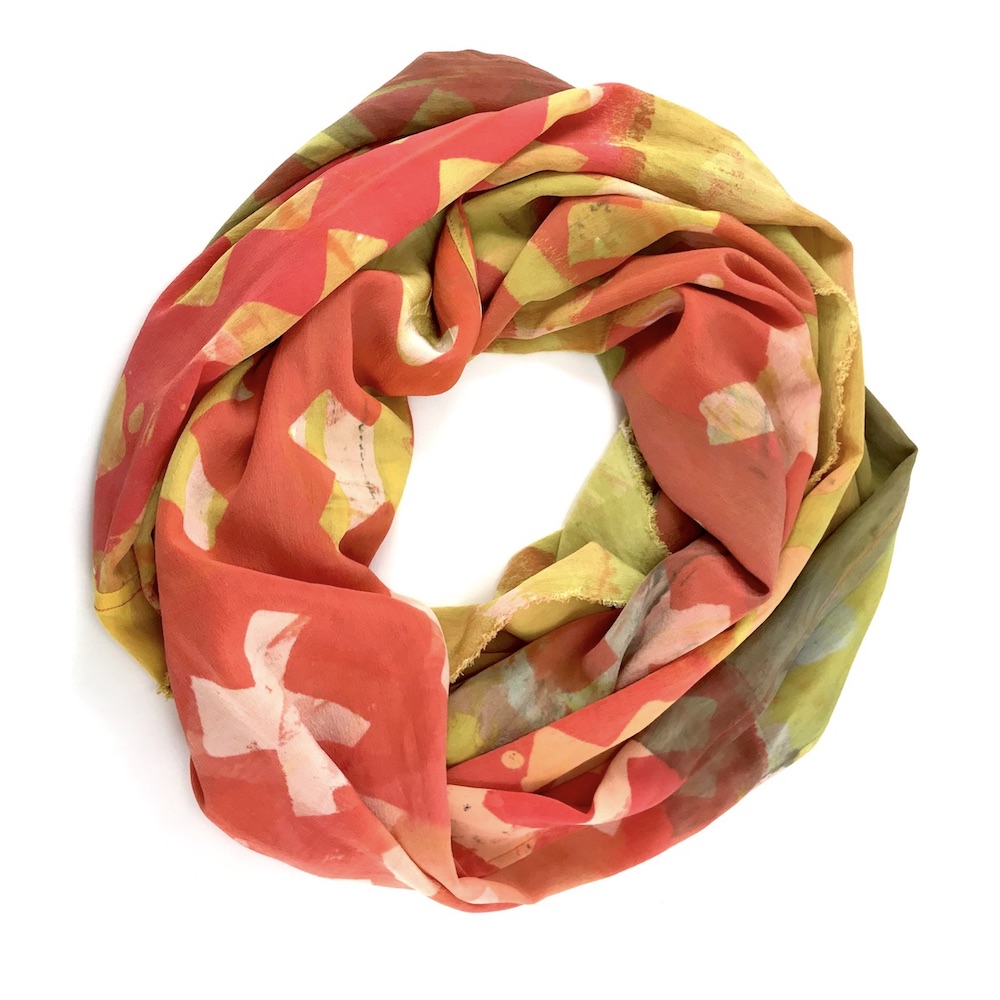 Subtle and bold combine with fabulous complimentary colors to create this unique wearable work of art. The scarf is sewn in a loop, hemmed along one edge, the other reveals the natural edge of the fabric.