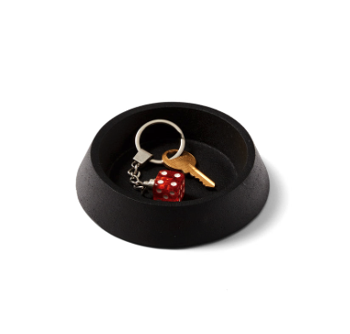 An iron catchall for holding anything from candles to key rings. Its raised and folded edge creates the illusion that it is floating just above the surface it’s placed upon. The edge also makes it easy to grasp and pick up.