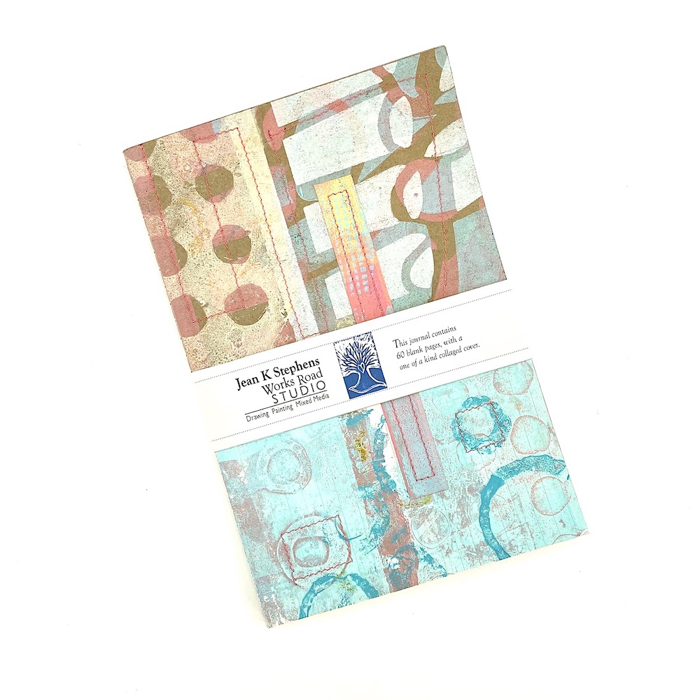 A handbound book embellished with a mono printed, collaged and stitched cover. 60 blank pages within to draw, write and record your thoughts! Each unique and one-of-a-kind!