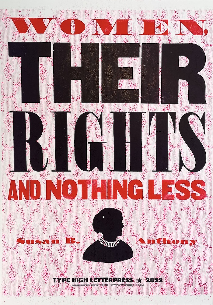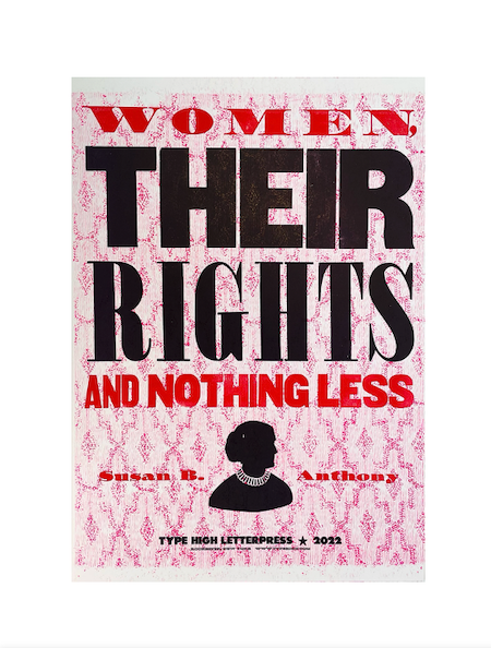 An important Susan B. Anthony quote, "A true republic, men, their rights and nothing more, women, their rights and nothing less." This three color letterpress poster is designed and handset with antique metal and wood type and printed on an antique press. Perfect for summer protests, or hanging in your window, or your office.