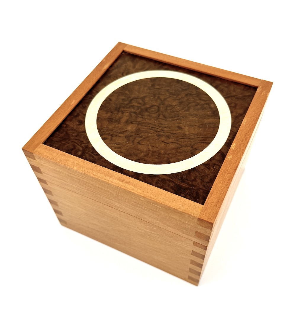 A fabulous veneered surface design and dove-tailed corners combine to create this lidded box for keeping special items. A rich array of woods and veneers are used and the artist has tucked a hand-written note inside that tells the full story!