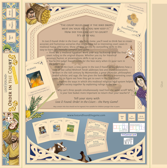 Order in the Court, a new game in the Lost & Found series, explores how a code of law called Mishneh Torah addresses lost and found possessions. Written in the 12th century by Maimonides, a great physician, philosopher, Jewish scholar, and sage, the law gives the basis for many interesting court cases. Try to figure out how they might have gotten to a court in the first place! Explore the ways in which this medieval religious legal system helped to hold society together by explaining rulings in the law. Why can’t three people simultaneously read from the same scroll? Why is your lost basket more important to return than your teacher’s? Tell your story with Lost & Found: Order in the Court – the Party Game!