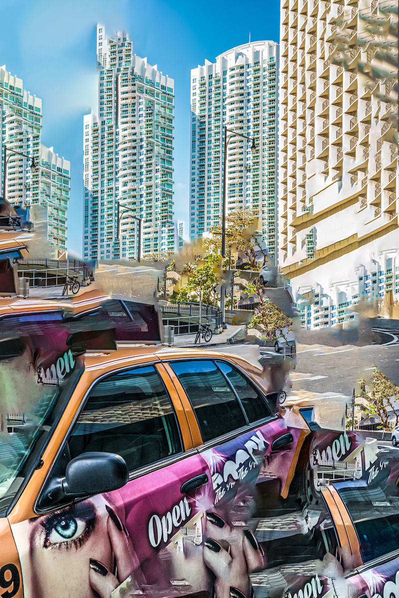 “My intent is to explore uncommon collisions of color and form, scale and movement. I want to rattle the bones of a building, shake common perceptions of concrete reality. I want the temporal elements shifting between both the original architecture and my imagination. I see immense possibilities dividing line, pattern and color. all potential new visual possibilities. The division of line is paramount. The original geometric intentions of structure degrade, line will wander and divide, spaces and color create new context. These images create a world off kilter, where conventional space is fraught; as if caught between positive ends of magnets.” – Bernard C. Meyers