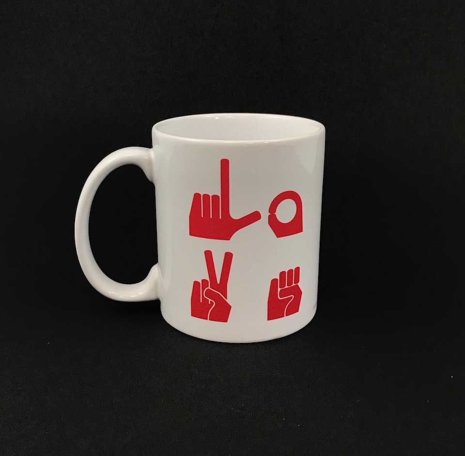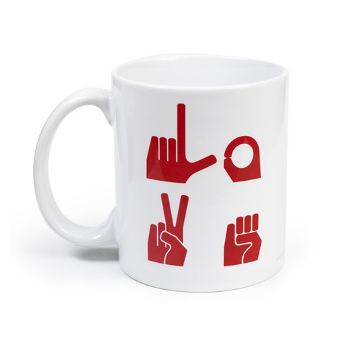 Start your day right with this awesome mug for tea, coffee or hot chocolate! The ASL Manutype Black typeface with 'LOVE' fingerspelled adorns this sturdy and useful mug - a Shop One exclusive!