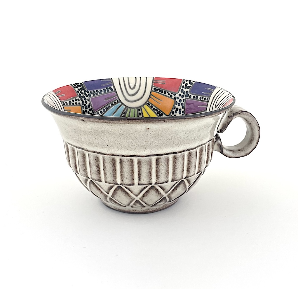 Beautifully hand carved and hand illustrated mug that is ample in size and can be used as a bowl, too! Cheery and delightful!