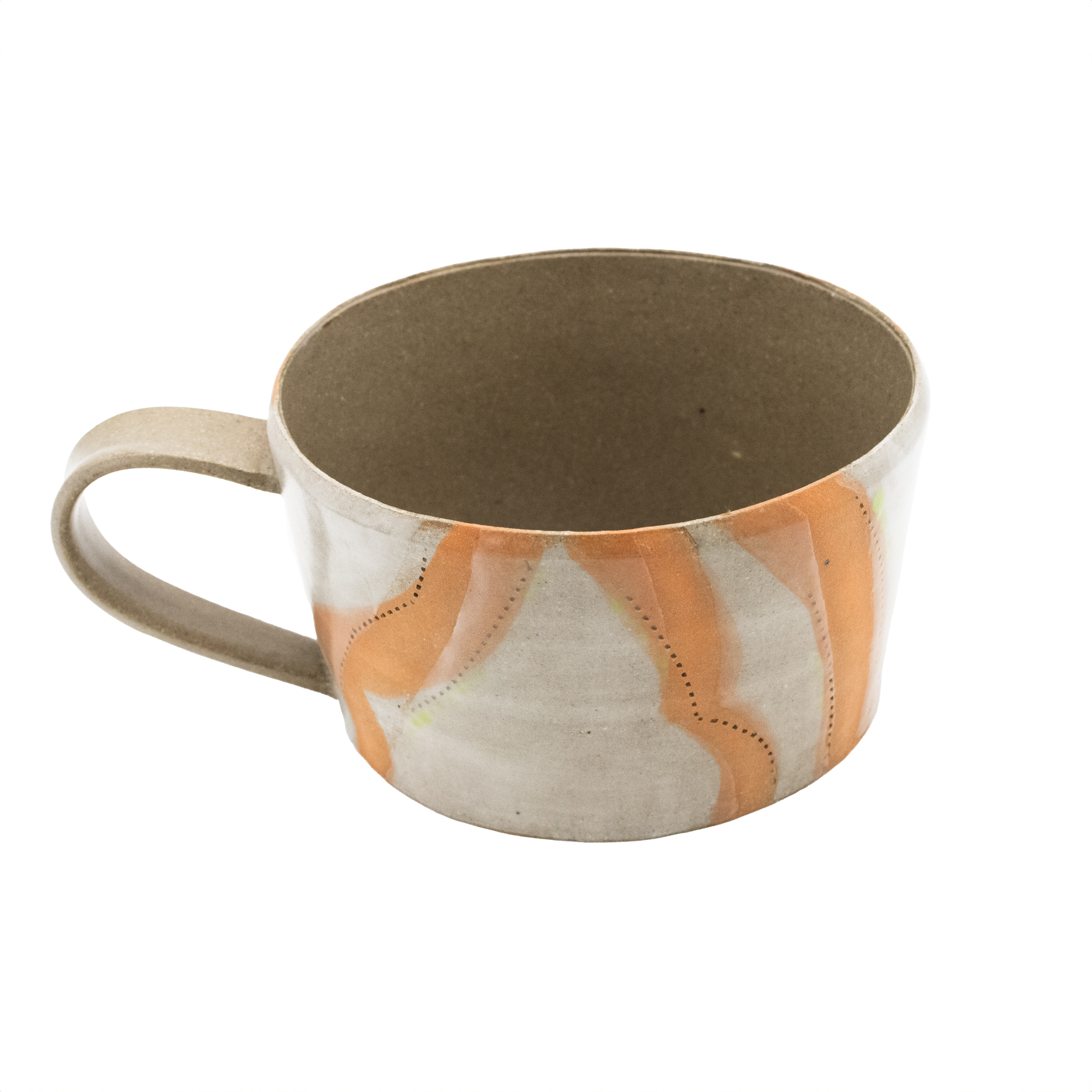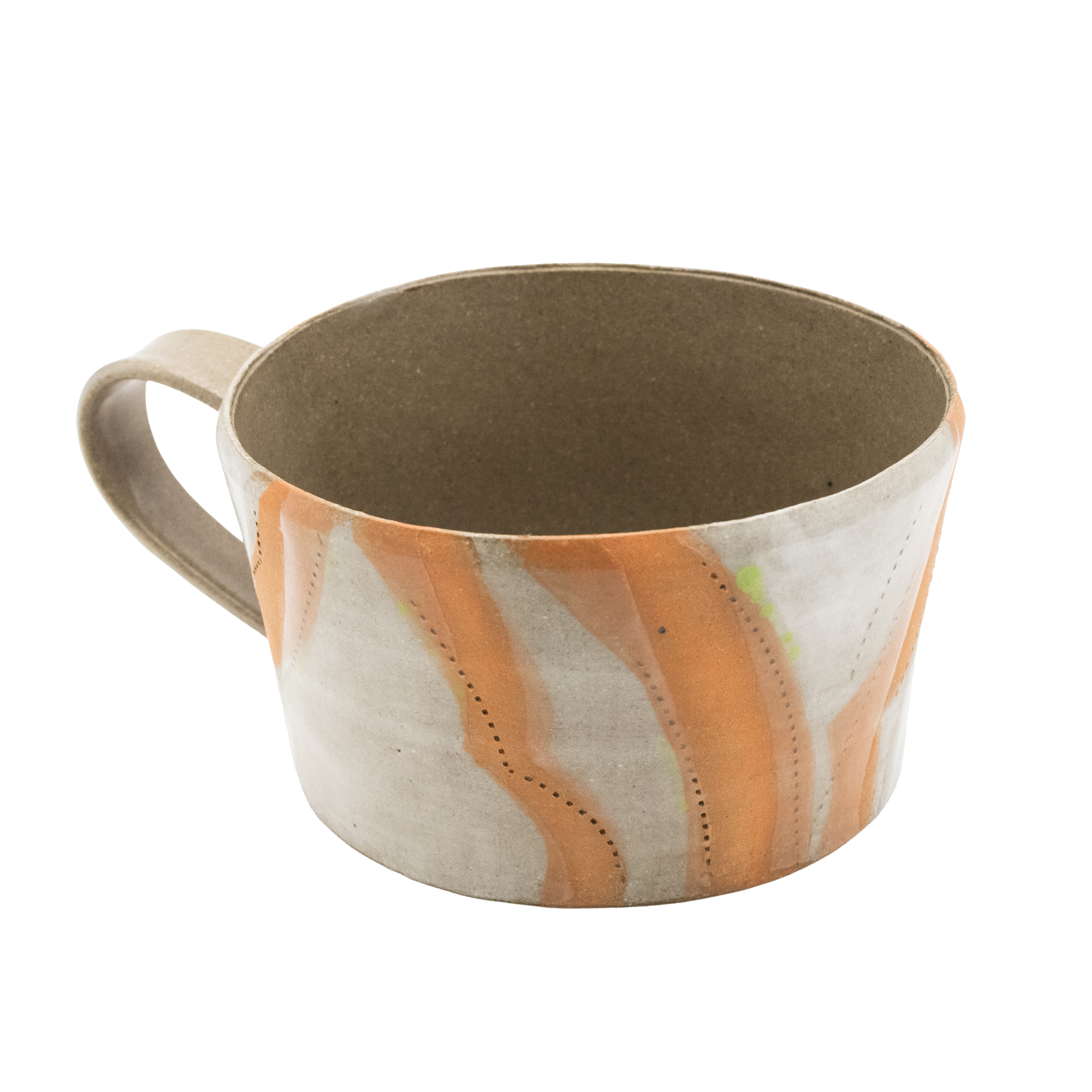 This refined trio of mugs explores the interplay of orange hues with ethereal themes, evoking warmth, transience, and a quiet sense of the sublime in everyday ritual. "Orange Dream," in particular with stripes of orange and elements of green creates a bright dreamscape with every use. One-of-a-kind.