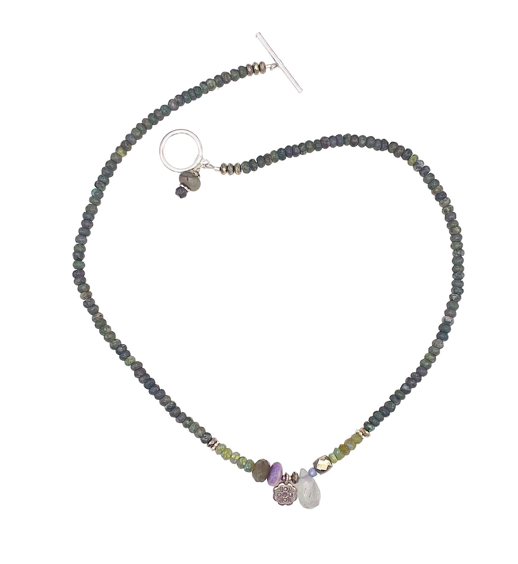 A curation of subtle, mossy-hued jasper, labradorite and other semi-precious polished stone beads. A wearable piece for a special occasion or everyday!