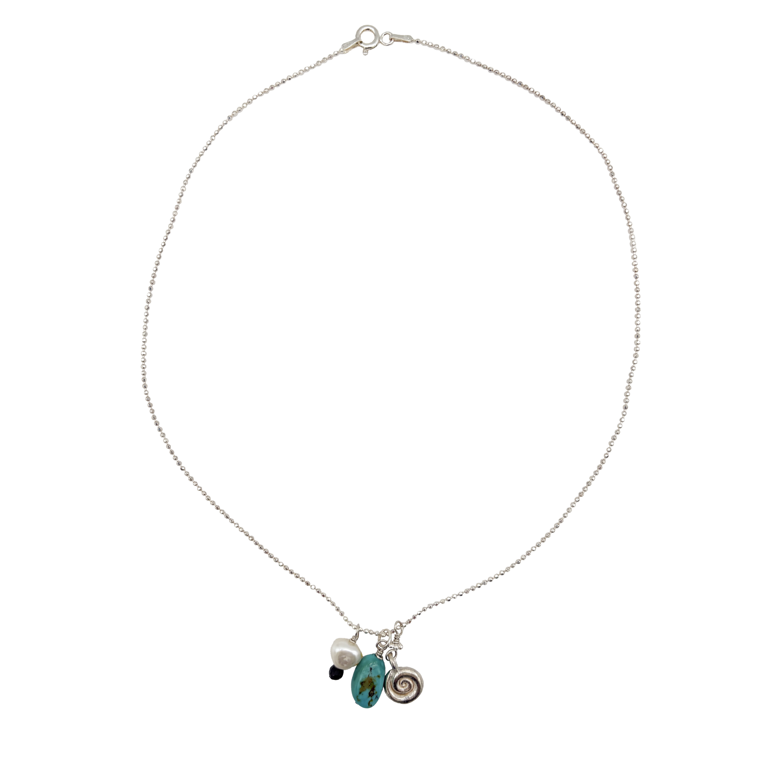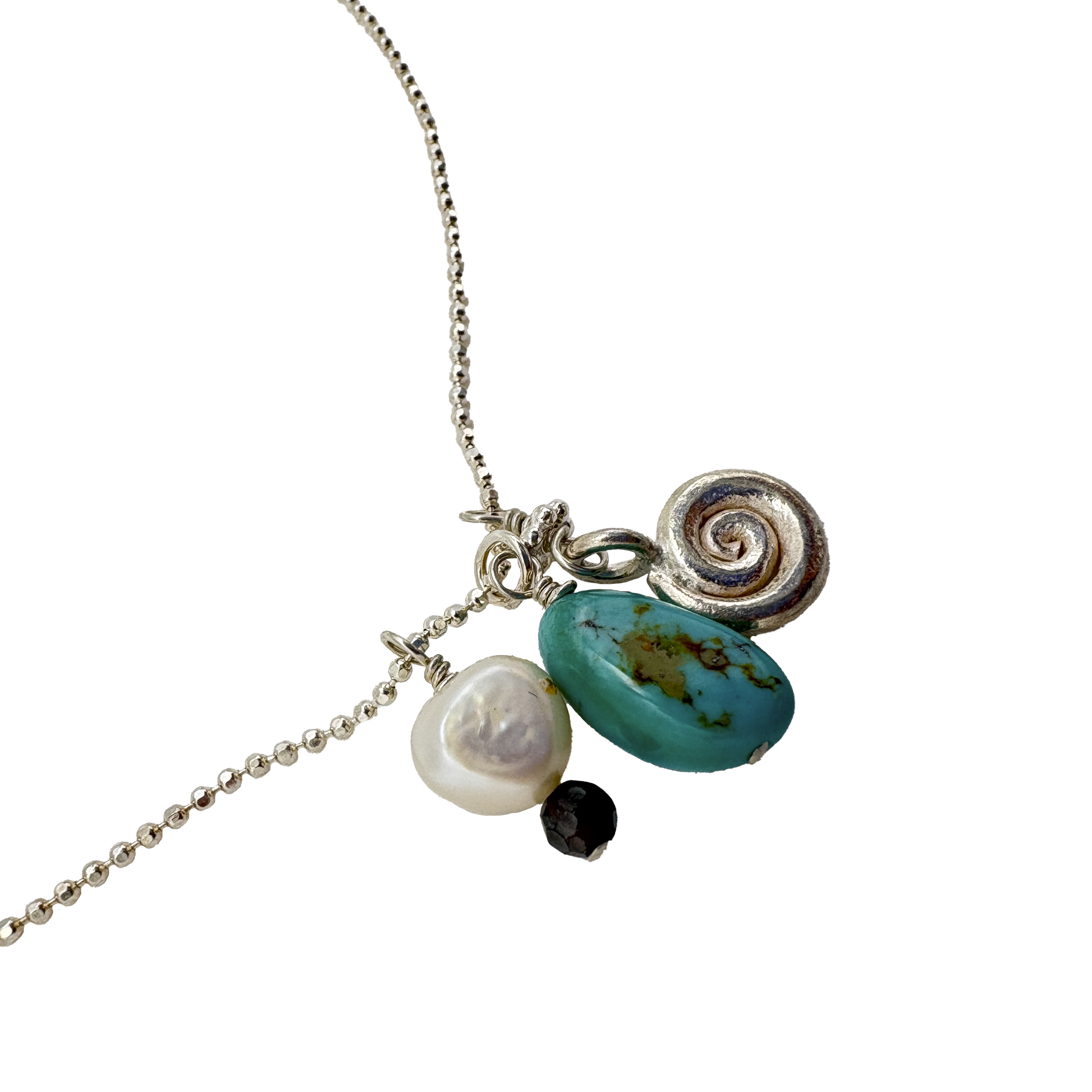 Gracefully designed with a luminous pearl, vibrant turquoise, and finely polished sterling silver, this delicate charm captures understated elegance and timeless luxury in a piece meant to be treasured! One-of-a-kind.