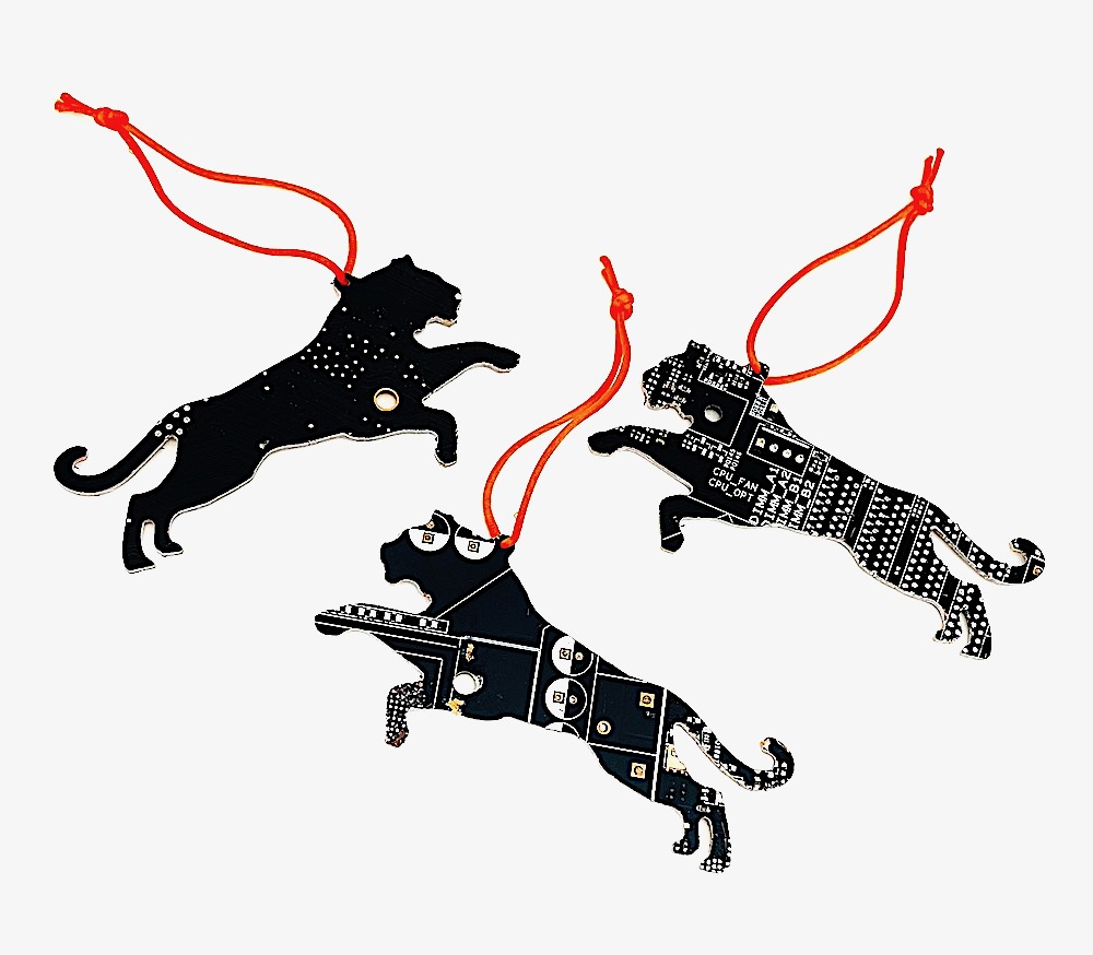 For the science geek in your life. Perhaps, that's you! This tiger ornament is cut from a black circuit board with the aid of a computer controlled routing machine. Sold Individually.