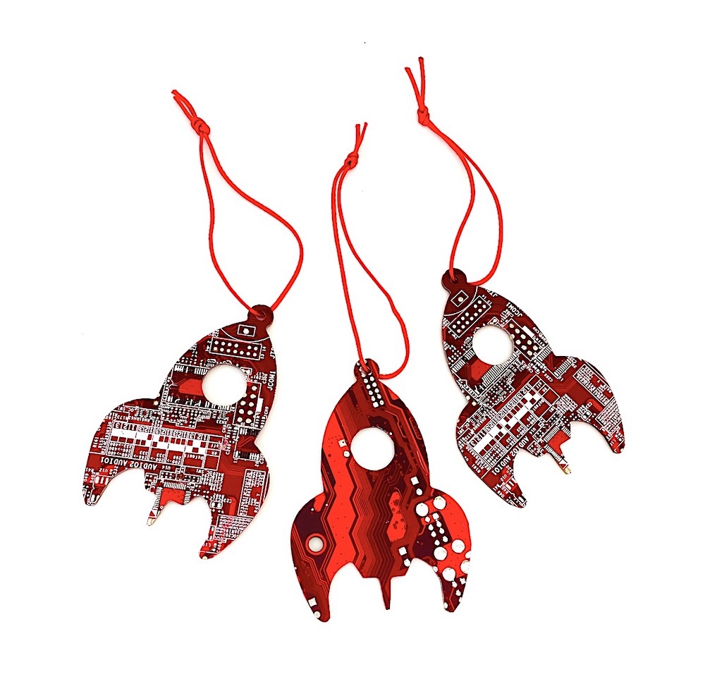 For the science geek in your life. Perhaps, that's you! This rocket ornament is cut from a red circuit board with the aid of a computer controlled routing machine. Sold Individually.